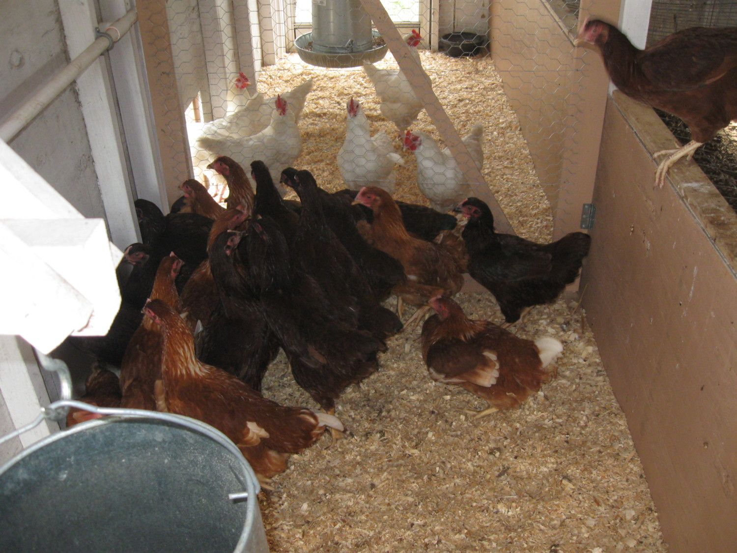 Here is a picture of one of the duplex coops. This is when I was using one side of the coop for a grow-out coop. These were RSL pullets I had hatched out with some of my Reese SC RIR pullets. This picture was taken a couple of years ago. The RSL pullets and the RIR 's I wasn't using in my breeding program were moved to one of the general population coops and pens but the breeder RIR hens are still in that coop.