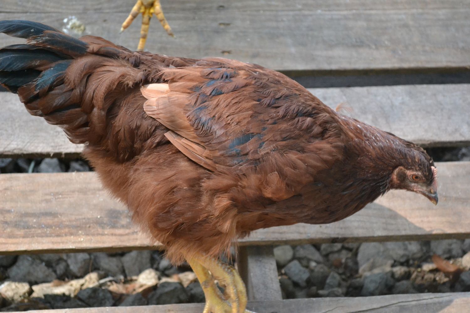 The wings have been clipped once so they still look a little funny from it but I do believe it's still production RIRThe Black in the tail in normal but the Black you see in his wing in this picture is not normal for a pure R.I. Red.