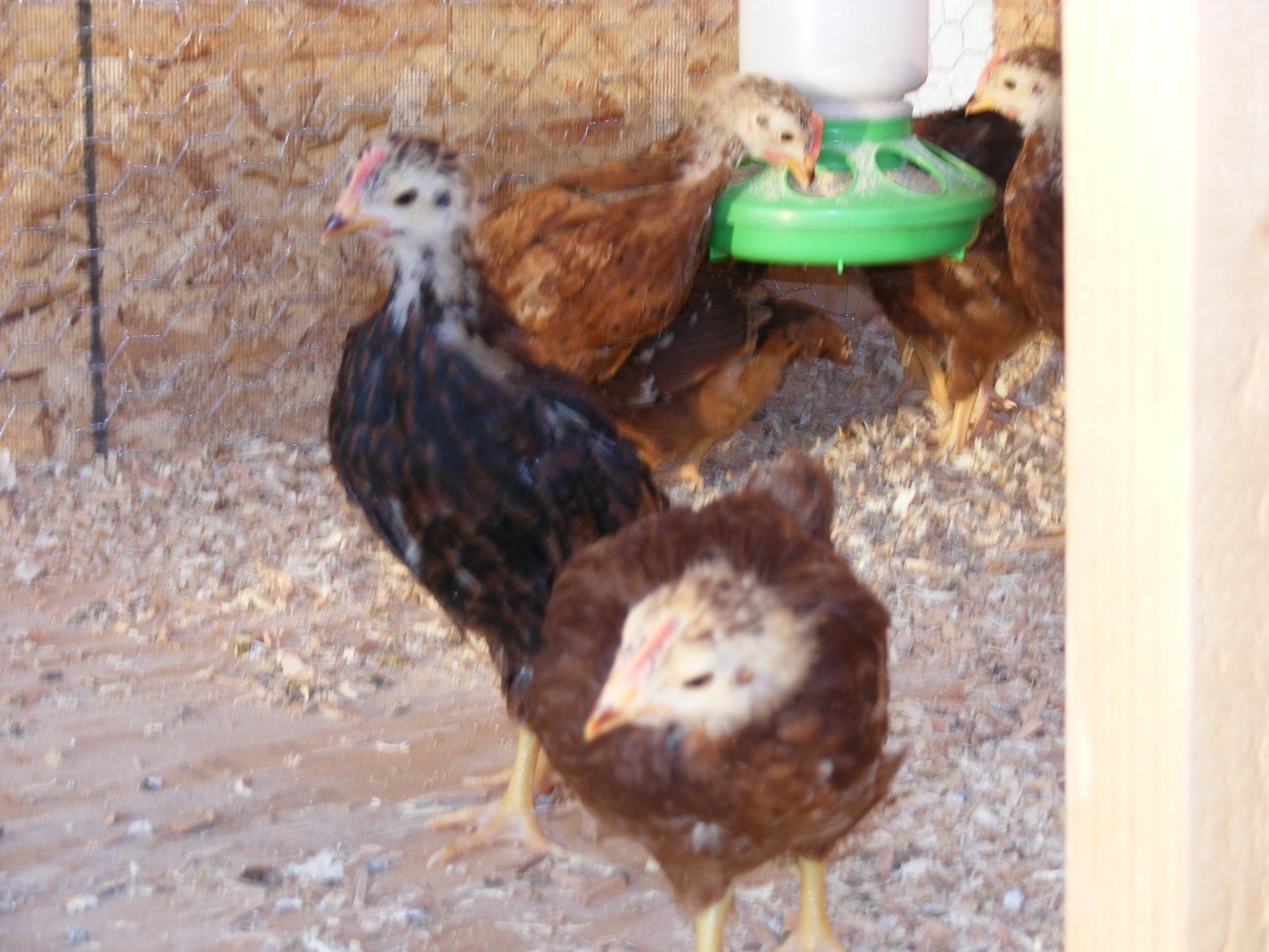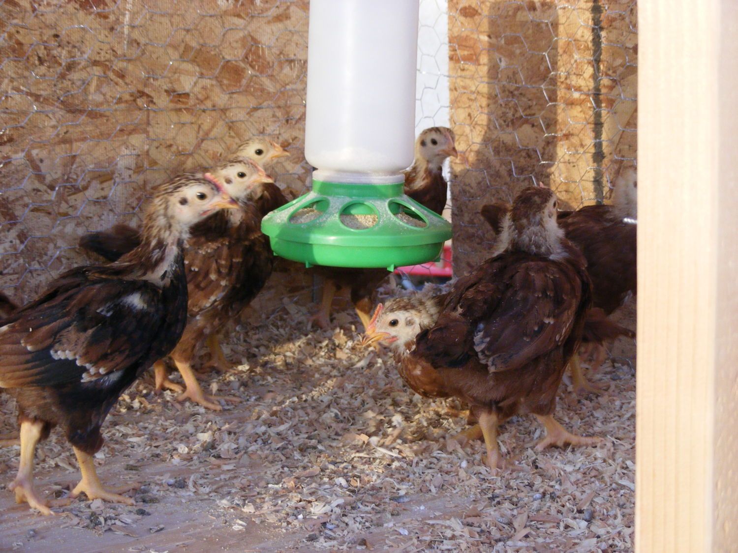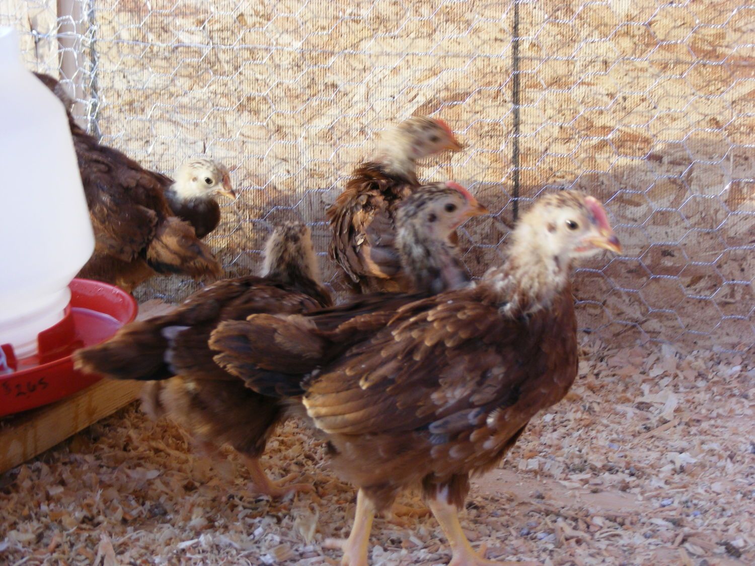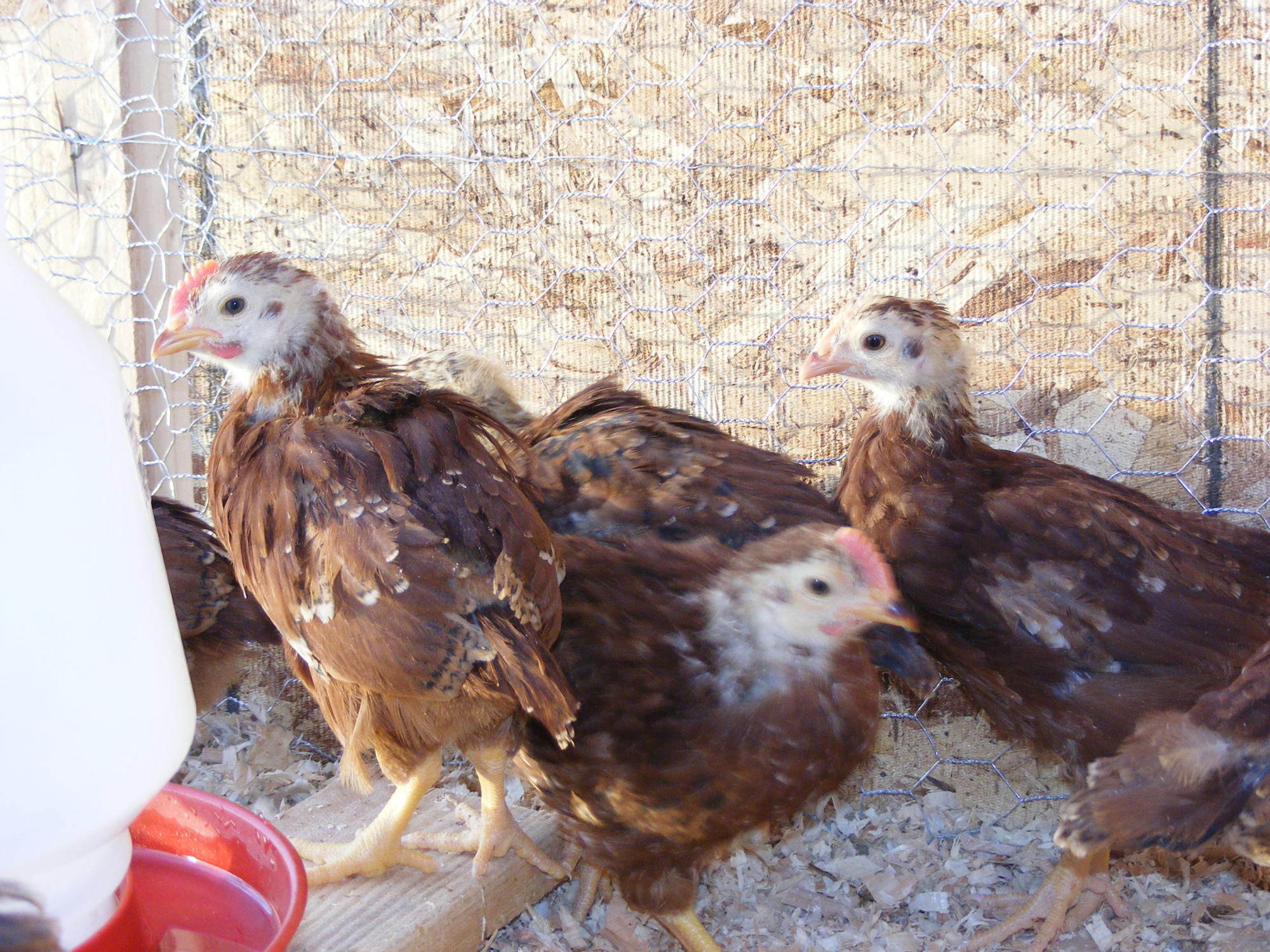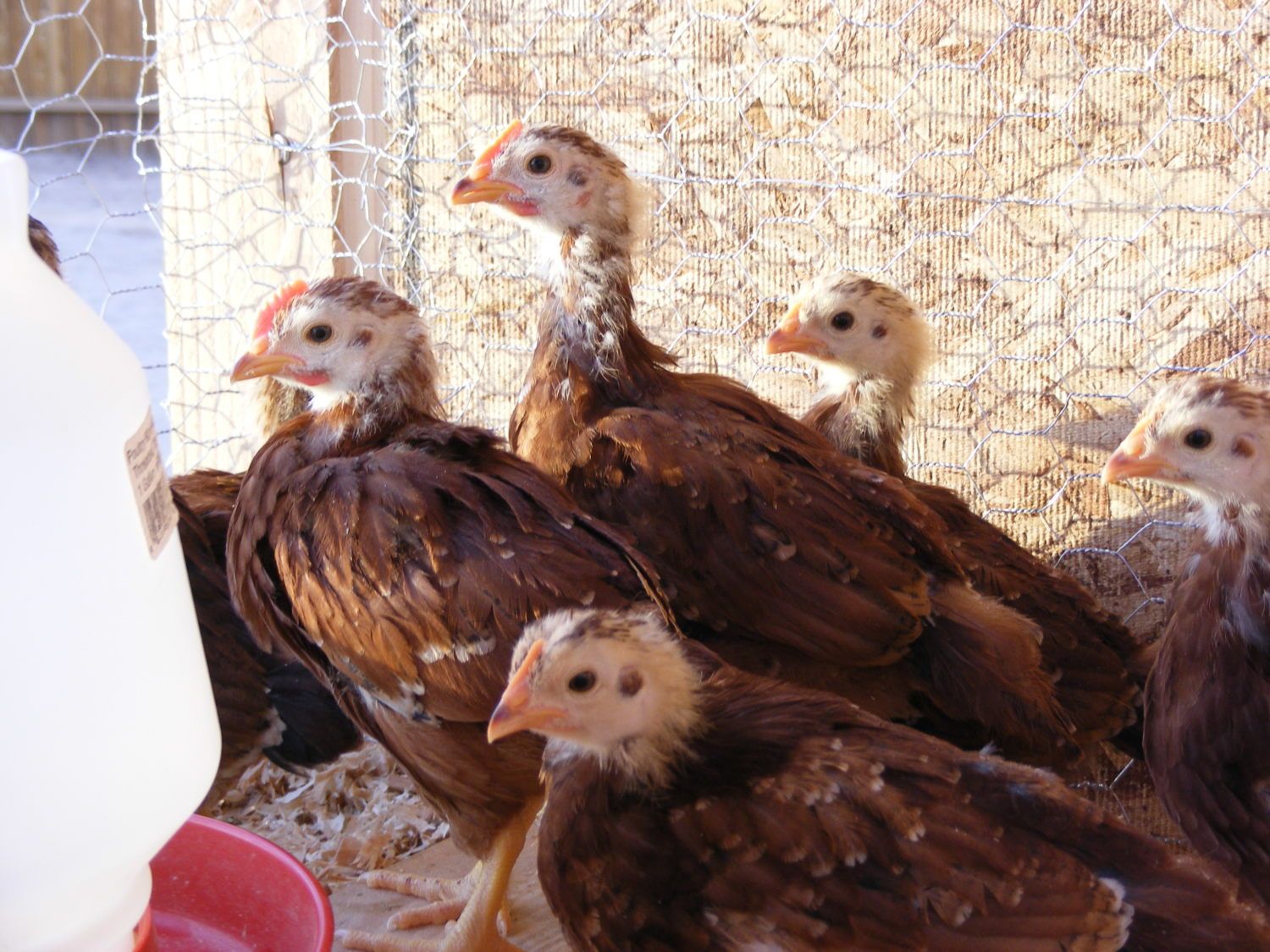 My hubby got 10 hatched chicks from the feed store and they told us they were RIR. I have one roo (i think) that looks very different from the bunch. Im a chicken novice and have no idea. I figured Id come to the experts for advice. Out of the 10 I think I see 6 roos and 4 girls. Are these true RIR or some other type, and if they are whats up with the black one? (I was in the process of changing out the litter when I took these pics. My chicks dont sleep on bare floors)