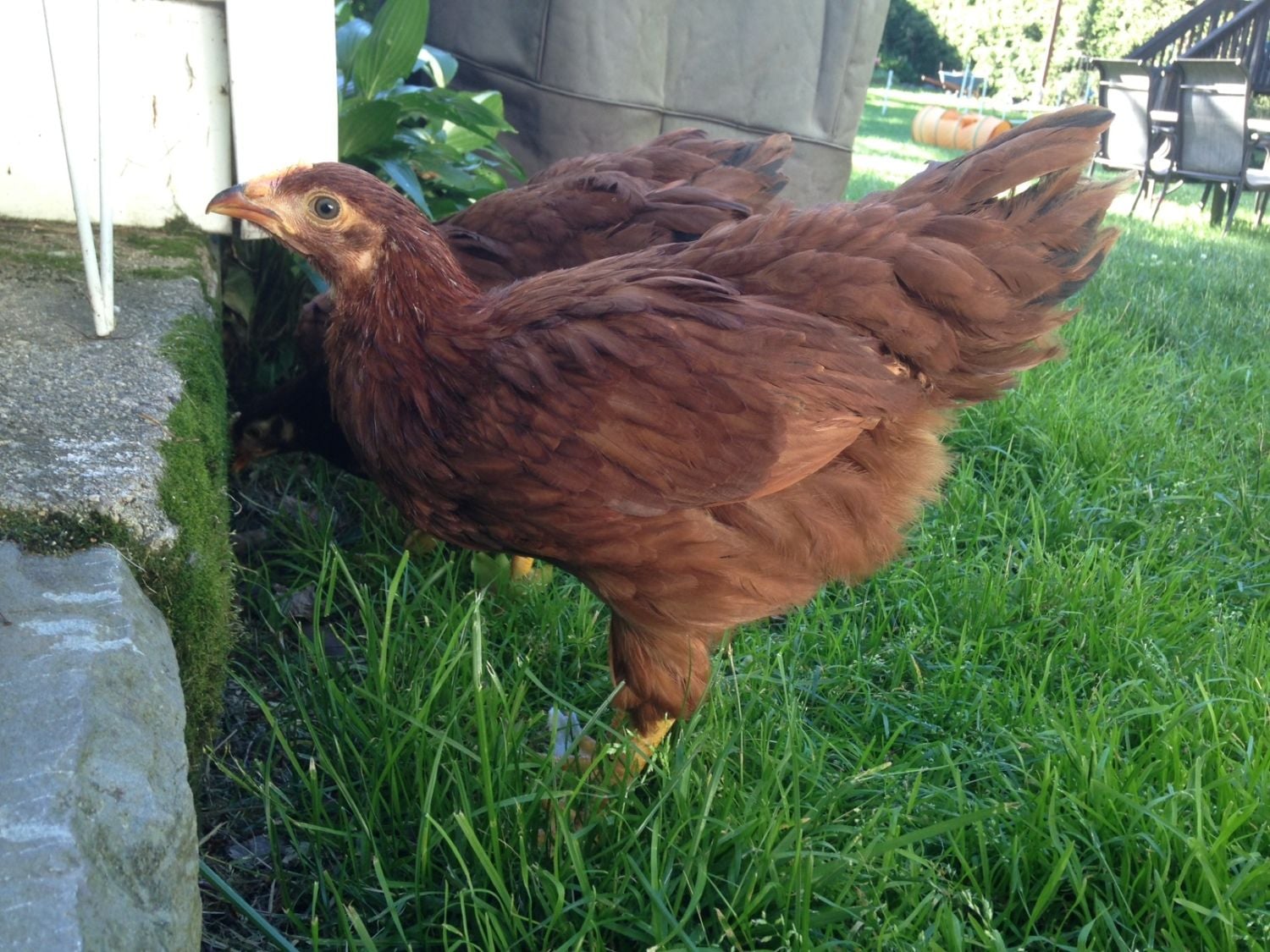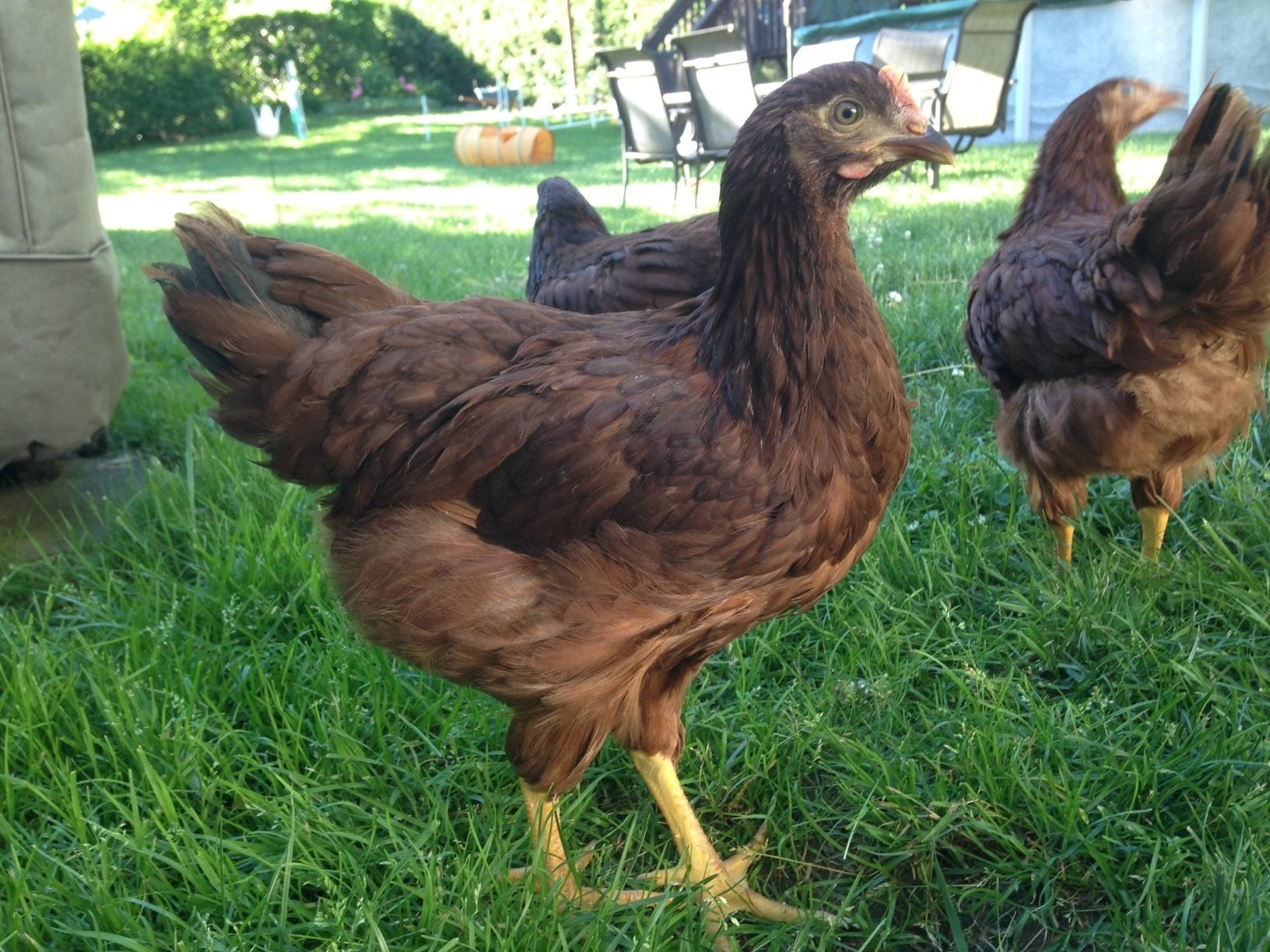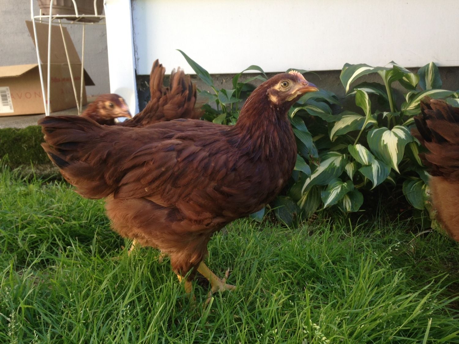 This is the one I'm most concerned about. Her name is Hedwig - she was one of the two with the head stripe. She's the biggest of the three and has the most developed/colored comb and wattle, even though I guess they're not /that/ big?