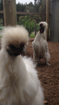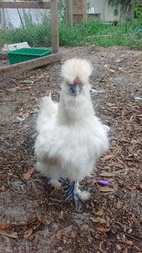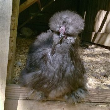 Name:Crooked Type of Silkie:Blue Age:5 months Gender:Cockerel(?) Username: LilJoe Crooked is the sweetest thing! When he was a chick he had wry neck. The poor boy is virtually blind! (Fluff covering eyes=can't see)