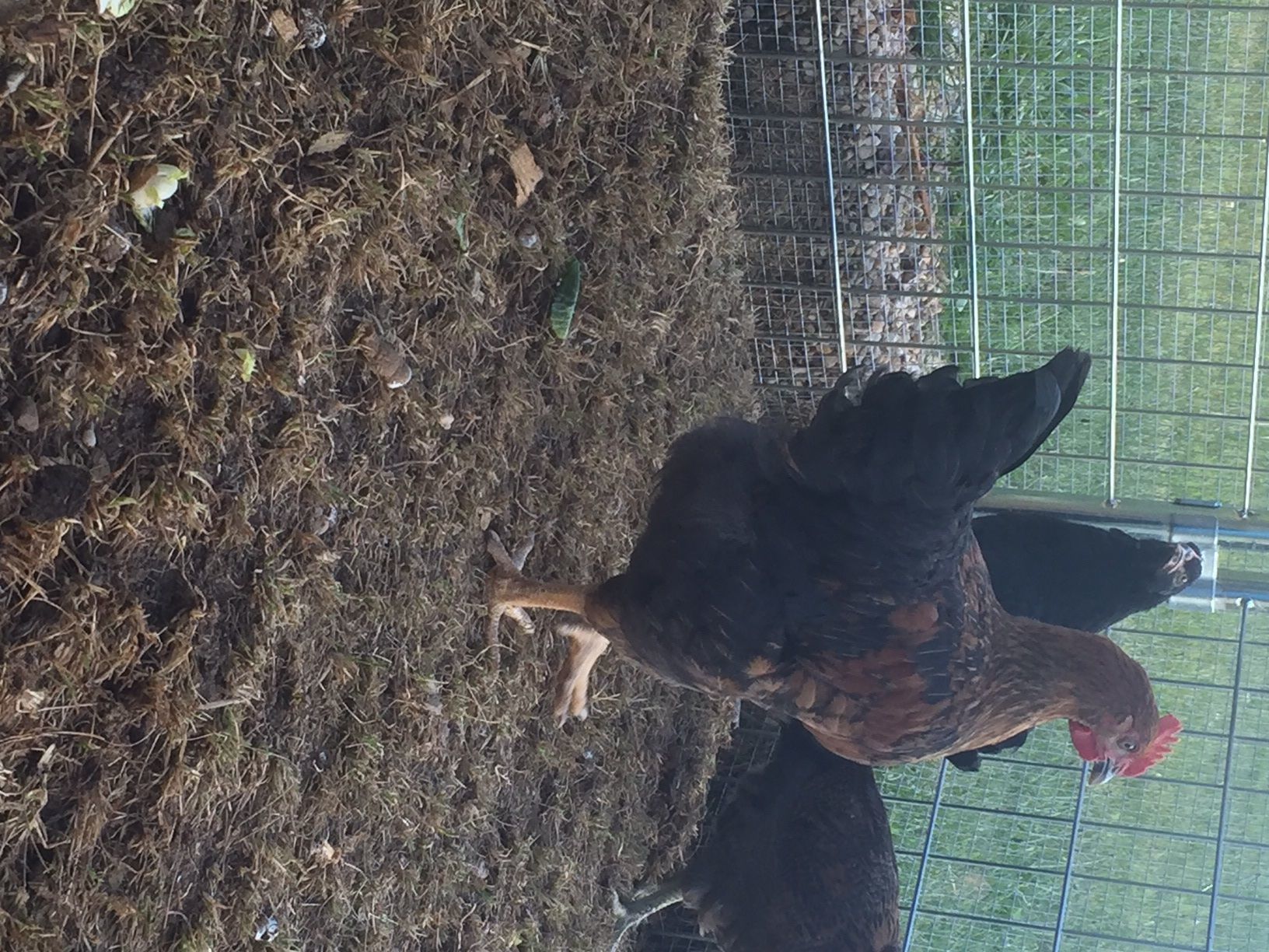 This is the friendliest of all my chickens and I'd really like it to be a hen and not a roo...however, it was the first one to grow a crown and for a long time didn't get along with the others...now it's just a sweet chicken. It does not, however, crow at all. I have no idea what breed or what gender... sorry that it's sideways...