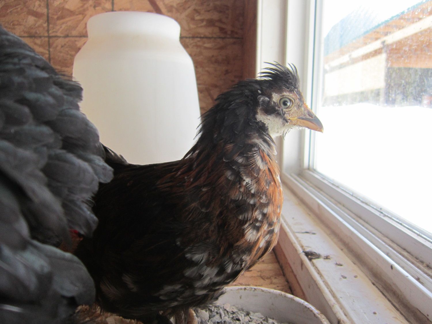 Just wondering what you think of my 2 month old chick. The father is a Cochin banty, mom is a polish cross. There is only one chick. It's comb has hardly developed at all yet. It kind of jumps up at my hand when I bring it close to it too quickly. When do roos start crowing? Any ideas?