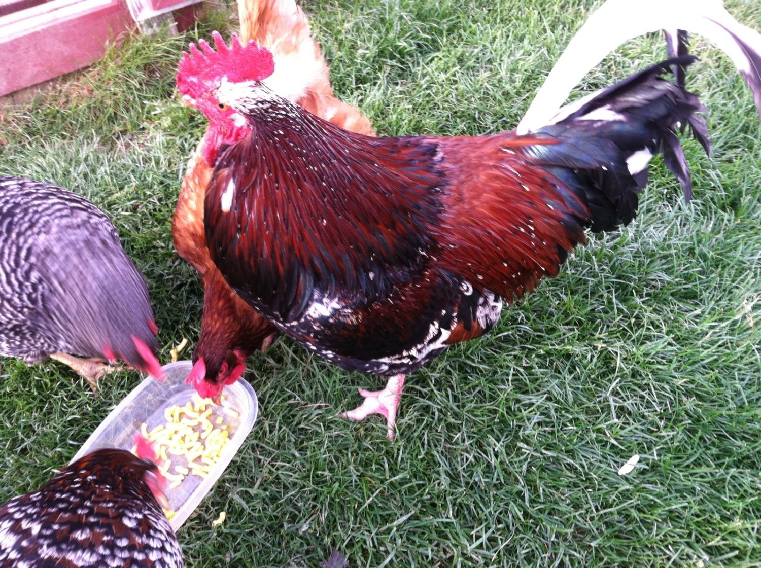 Below is a pic of my rooster, Minky and girlfriends. They get a treat almost every night. Last night was mac and cheese.