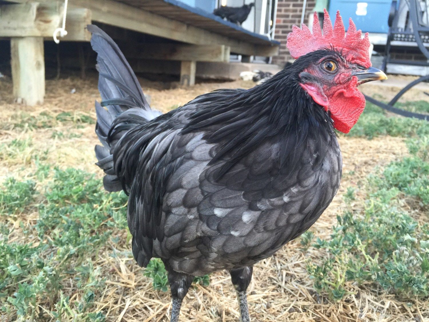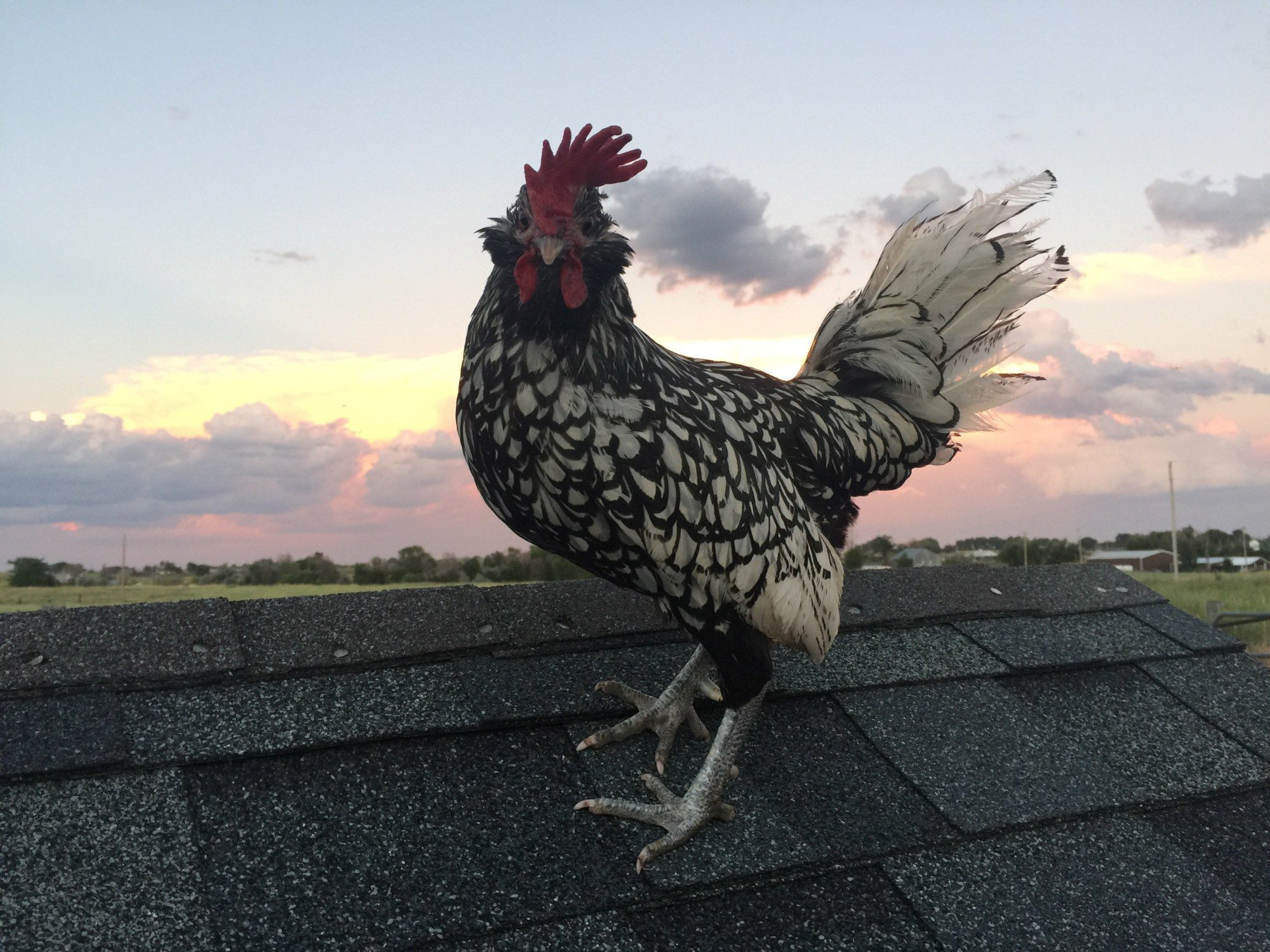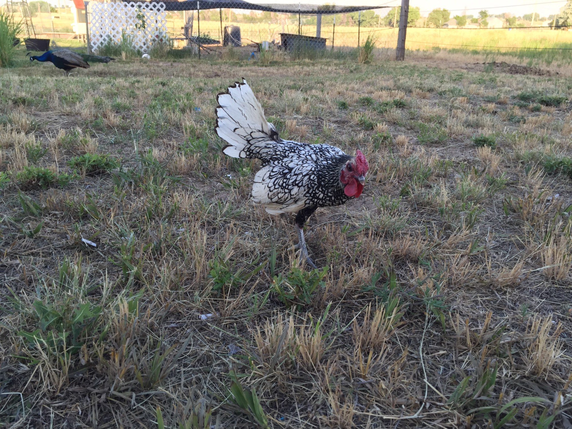 This is Odysseus (2 years old). He's a Silver Sebright and the rooster that got me started with chickens. He showed up out of nowhere about 2 weeks after I started walking again (I was in a really bad car accident in 2014). No one claimed him, so I started taking care of him. He's pretty ornery and hates my rubber boots with a passion I didn't think a chicken could have.