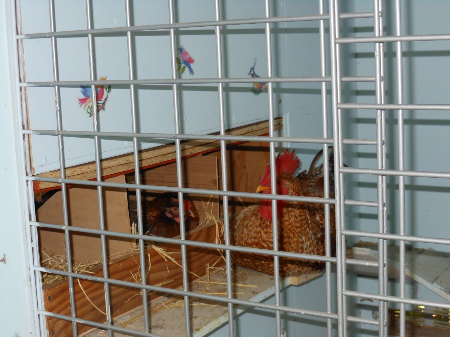 We've got a sweet Golden Comet (red sex-link) hen who is maybe 6 months, and is laying. The other 3 are pullets (a Barred Rock, an Easter Egger, and a Barnevelder). We got the 4 girls a rooster (gentle, quiet Old English Game bantam mixed with some larger breed) who is likely 3 years old. His name's King Alfred.