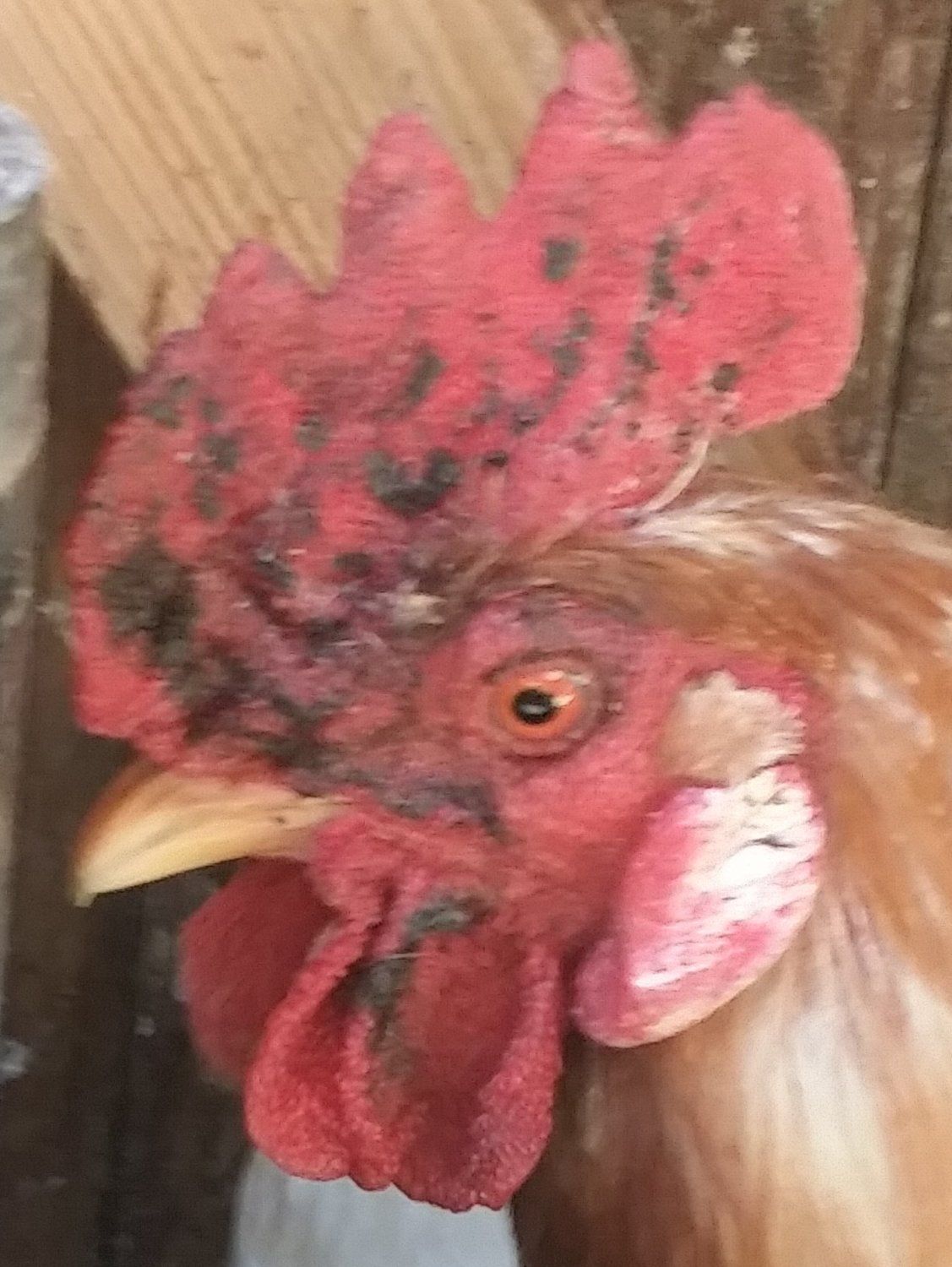 Rooster has black splotches on Comb and Wattle