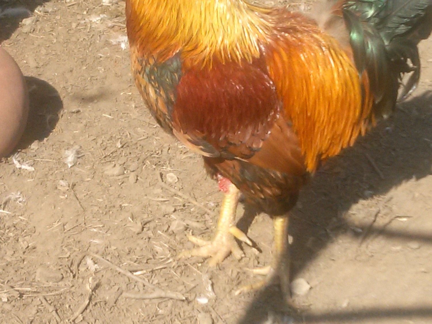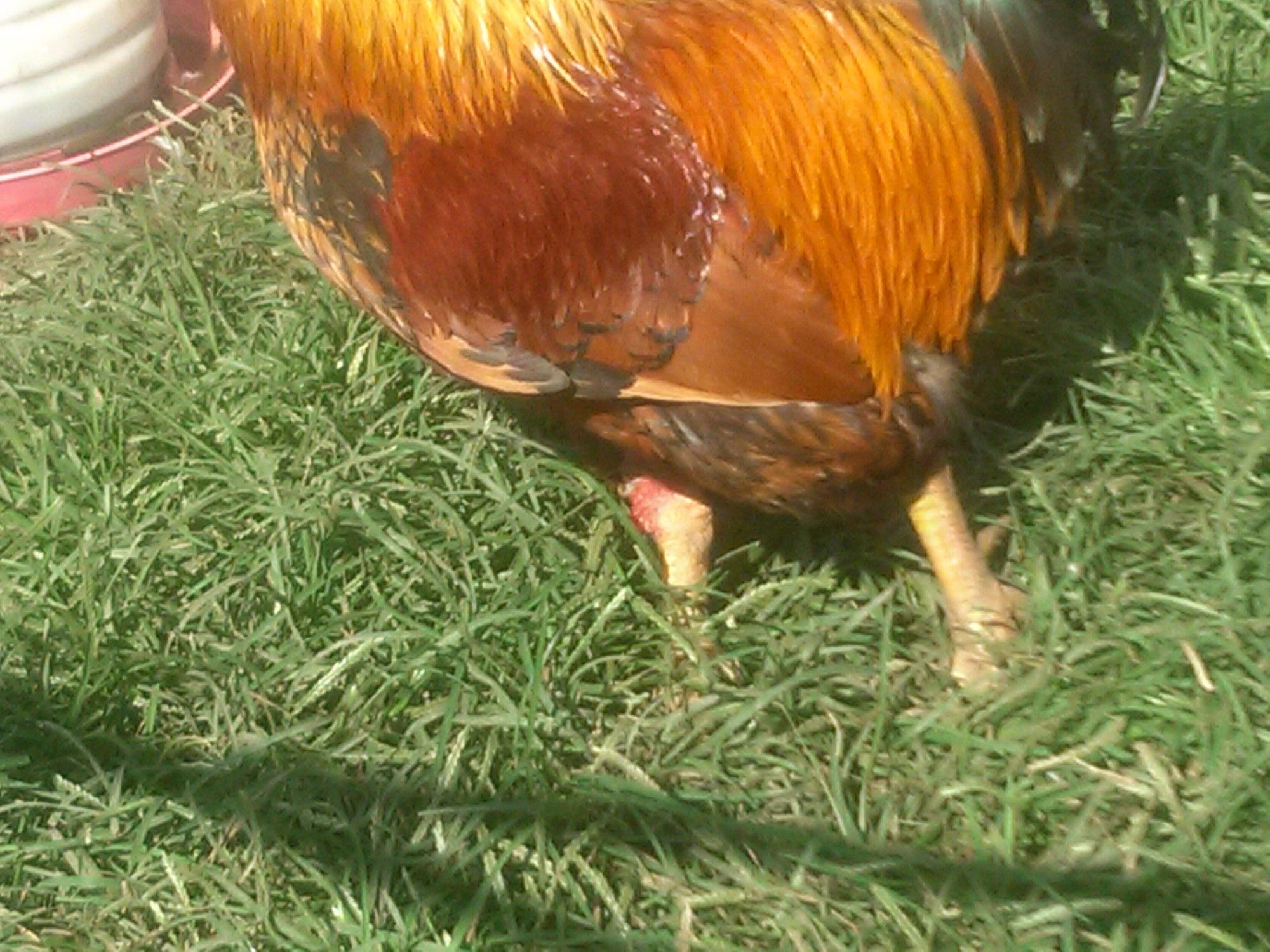 I have a wyandot rooster whose knees seem to be battered to heck and back. It kind looks like when you fall down on gravel, but it was all broken glass.... Sort of like the face of a muscovy duck, but on his knees. I took a close look at them a while back and though maybe he was just fighting and got the losing end of it (no blood), but it's been a while and they don't seem to have "healed".