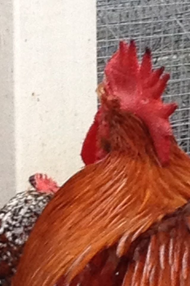 Your rooster looks like he could have some very mild frostbite, or just circulation problems in his comb (common in large-combed birds during cold weather). The marks on the hen's comb look like pecking wounds, though they could also be the beginning signs of Fowl Pox. If you want, you can put some antibiotic ointment on both birds' combs to help them heal.The tip of my roosters comb is bruised looking and two of my hens have scabby sores on their combs. It did get down to 29 degrees one night but for safe measure I put vasoline on all 7 birds combs, waddles and feet. Two days later theses spots showed up. They don't seem sick or bothered by theses spots. What could it be and what can/should I do?