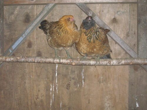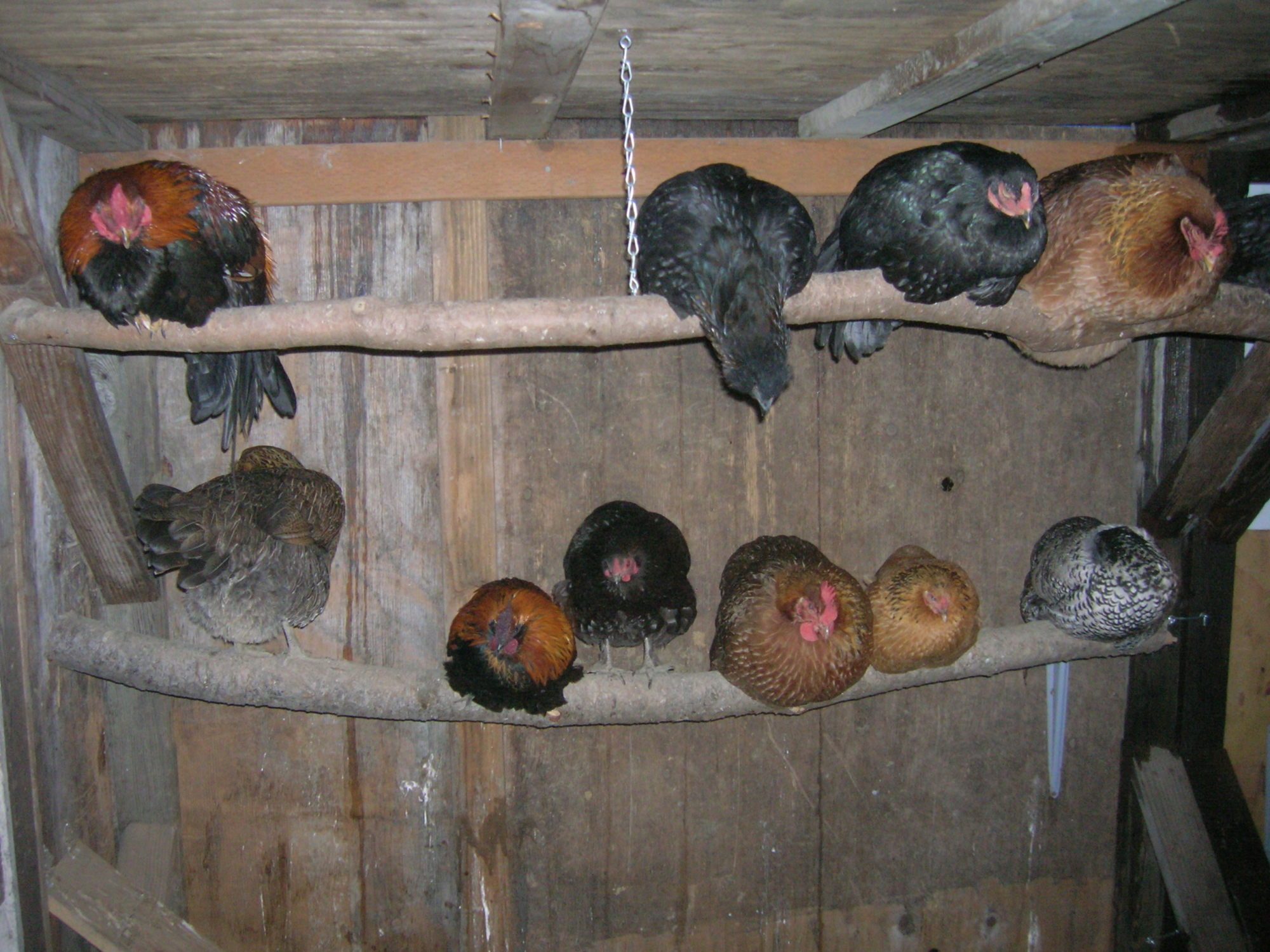 I use cut branches, 2x2s and 2x4s with both the 4" side up and the 2" side up, at varying heights. If you have them at varying heights you have to make sure that they are not right on top of eachother. Mine are at different distances from the walls so they are not pooping on eachother at night. The 2x4s that the Golden Sebrights are on were not meant to be 'roosts', I just intended them to be supports for the nest buckets and the real roosts (bottom picture). Most of the birds have switched to always roosting on the cut branches which tells me that is what they prefer (above). I even put up a roost branch for two young hens who were getting kicked off the main roosts (below). The new roost branch is more difficult to get to but more birds are choosing to roost on it now too instead of the cut lumber.