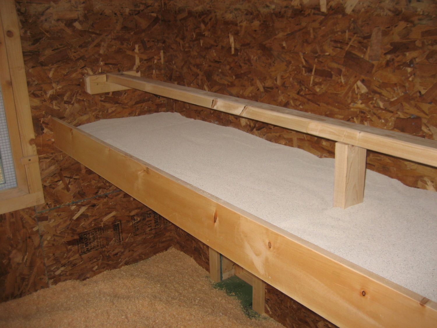 Tracecom, I'll have to run back out in the 3 feet of snow with my camera and get back to your question. In the meantime, here are some pics of the setup. I find that half of them roost on the 1" outer rim of the poop board, facing either direction. Obviously if they face the wall, they wind up pooping on the floor pineshavings. But typically 95% of the poop winds up on the PDZ. My poopboard is 24" deep, ~40" high with a 2x4 roost centered 8-10" above the board. The poopboard is secured to the wall by a strip of wood screwed to the wall and the legs around the nesting boxes. The board itself is in 2 pieces and can be removed if nec. Most of them can fly or jump up. For the buff orps I provide an 18" high stool and deep fluffed up shavings to buffer their landing back down.