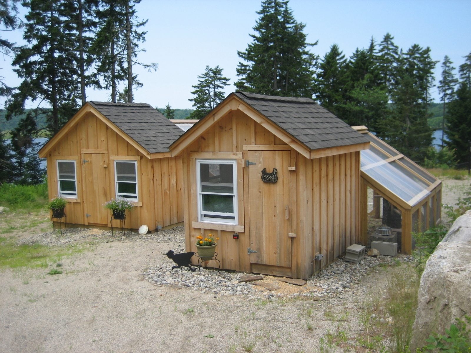 What I might have done differently is to provide a bit more space between the 2x4 roost and the poopboard lip. Those on the roosts are constantly pecking at those on the outer edges and it takes forever for them to settle down. The roost could be placed closer to the wall. The 10" that I have provided is more than enough. (24" minus the 2x4, divided in half = 10" from the wall and board lip.) They have plenty of room and never poop on the wall. Some of them sleep in the PDZ against the wall. The longer roost is ~9.5' and shorter one is ~5.5' in length. More than enough for the 8 bantams and 8 reg sized hens. I extended the wall supports for the roosts towards the wall so I can move the roost back for easier cleaning. (I'll take a pic of that also. I showed my carpenter exactly what I wanted and he didn't do it, so I had to add it later.) This set up is in a 6x10 coop. I'll get back to you.