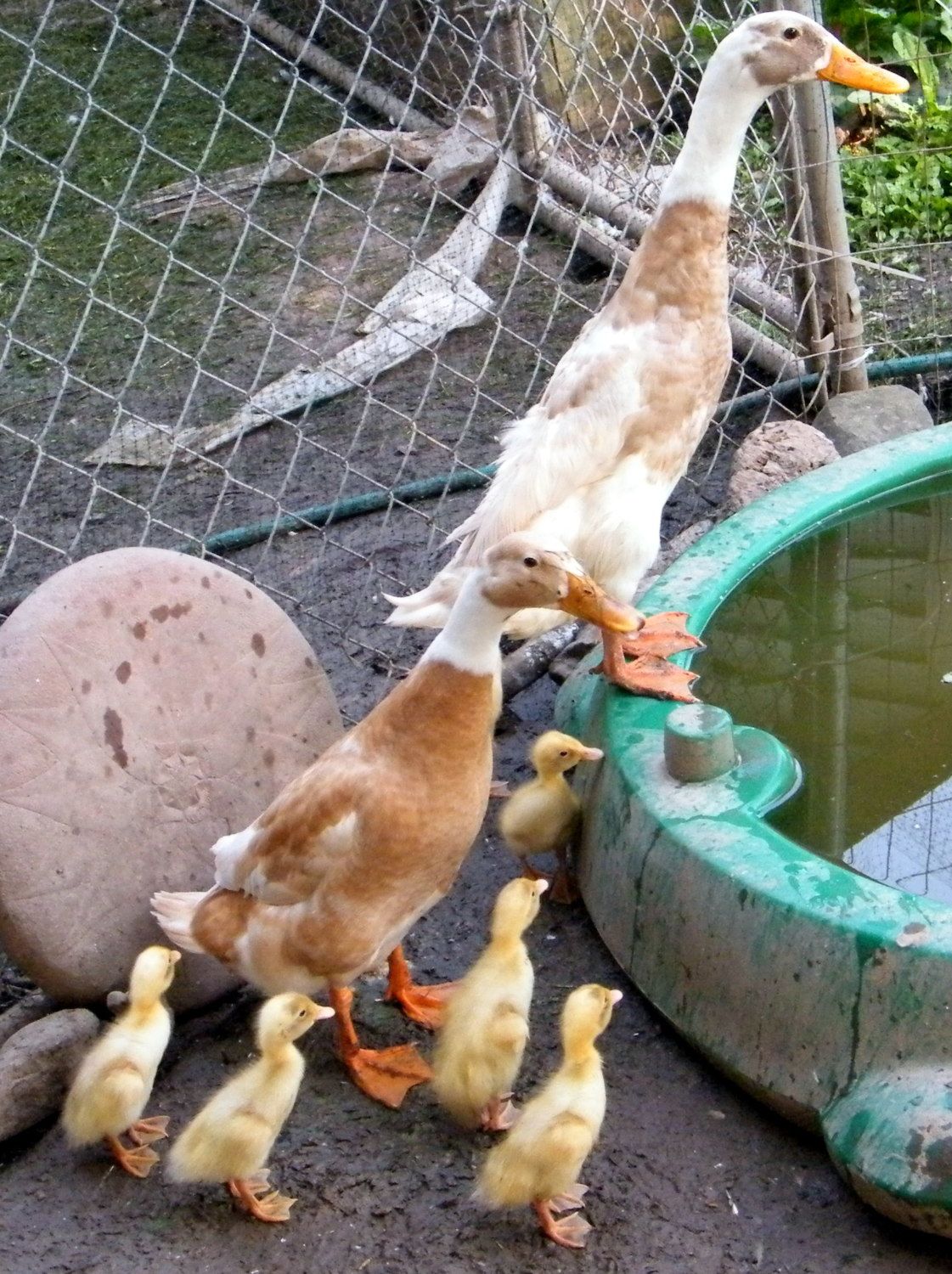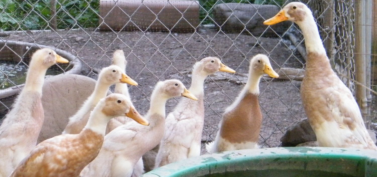 Our Fawn and white Runners. Patrick, Penelope and the babies. The babies are 8 weeks old.