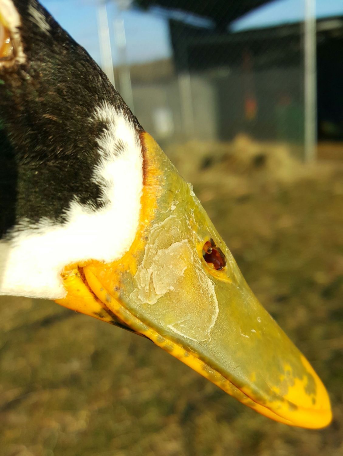 Not sure but mine had the bill peeling bad and then I changed the diet and it's been better. When my drake was younger and on 18% all flock pellets, he sometimes shed large, thick pieces - and they caused problems when they had only partially fallen off and would catch on things. Then I changed my drakes to more scratch and less protein than the girls. Two thirds scratch to one third lay pellets or to a quarter 18% all flock pellets. They occasionally get veggie treats, too. It could be that he simply outgrew the problem, but since the diet change he has never shed more than small, thin pieces.