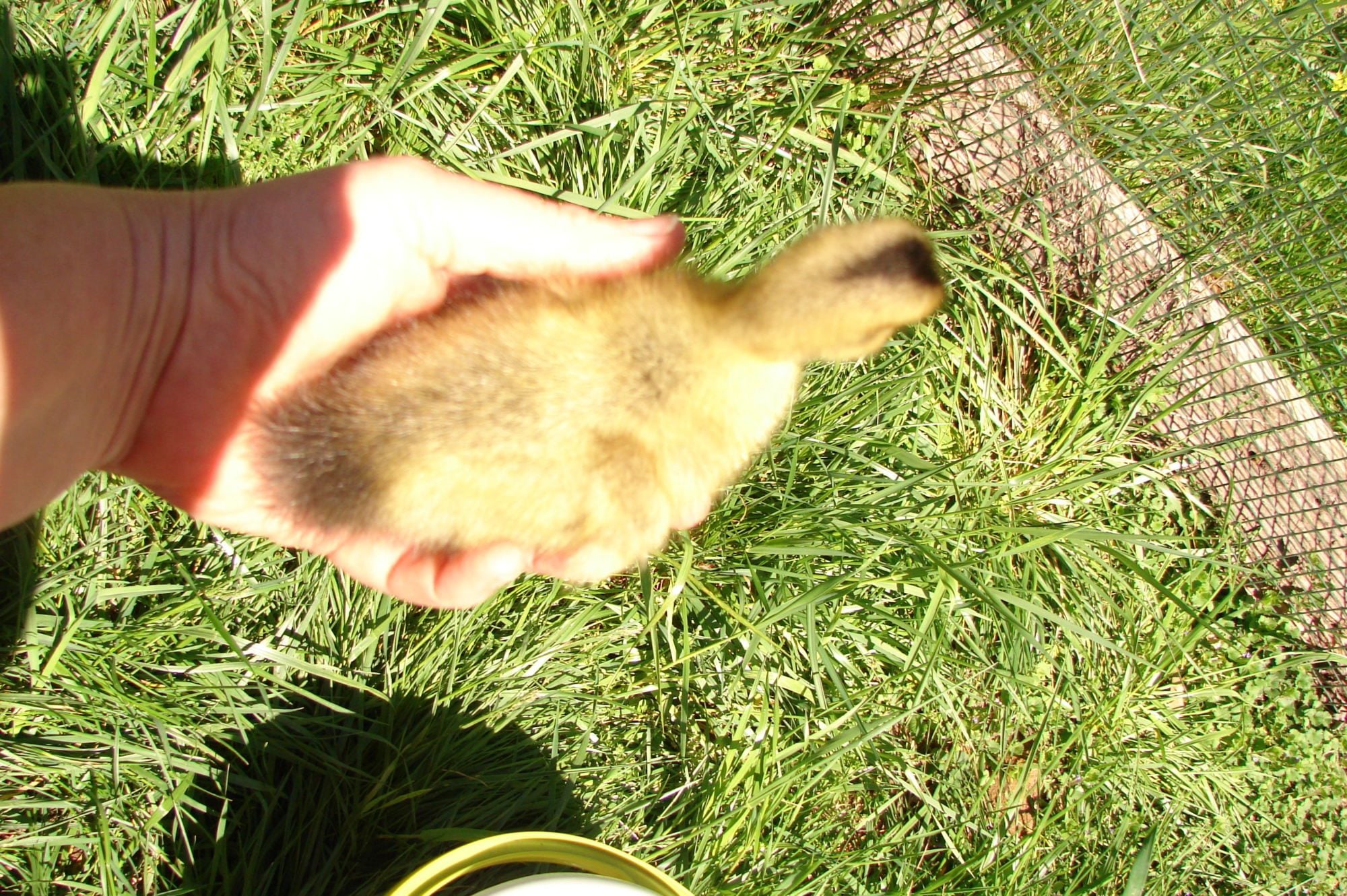 [/COLOR] At TSC I saw a duckling (right) that looked almost like an Appleyard duckling, except that it has a black undercoat. Very strange. They didn't know what breed it was. It was also 8:00, closing time. However, this duckling happens to be very quick and athletic. It jumped right into my cart. Followed by a slightly darker friend (left)who looks like a cross between an Appleyard and my duckling. Which is, of course, impossible. But they were both happy to jump out of the cart again once I reached my car. I put the two new ducklings in with my sick duckling. She (?) weighed 50 grams. They weighed 70 grams. It worked well. [COLOR=B42000]