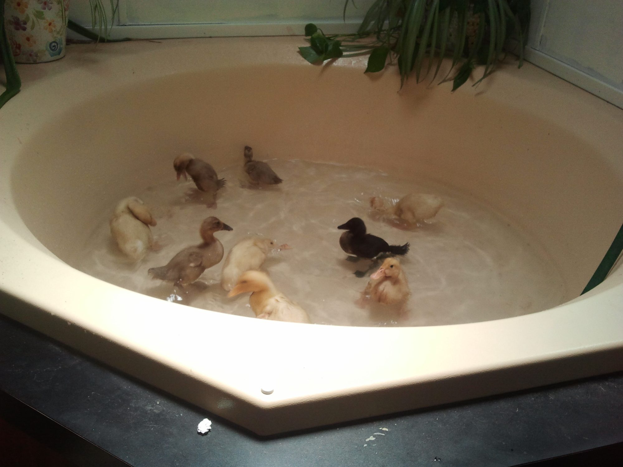 Ok I'm trying (first time) to post a pic with a new to me device. Hope it works! So you'll see a big Pekin on the far right, to her left is my dark drake and on the far left is the light drake. Behind them is the duck and my special Khaki Campbell Mom. (The runners adopted her and her babies) The dark duck in the background was hatched by Khaki but currently is mothered by the runner duck.![]()