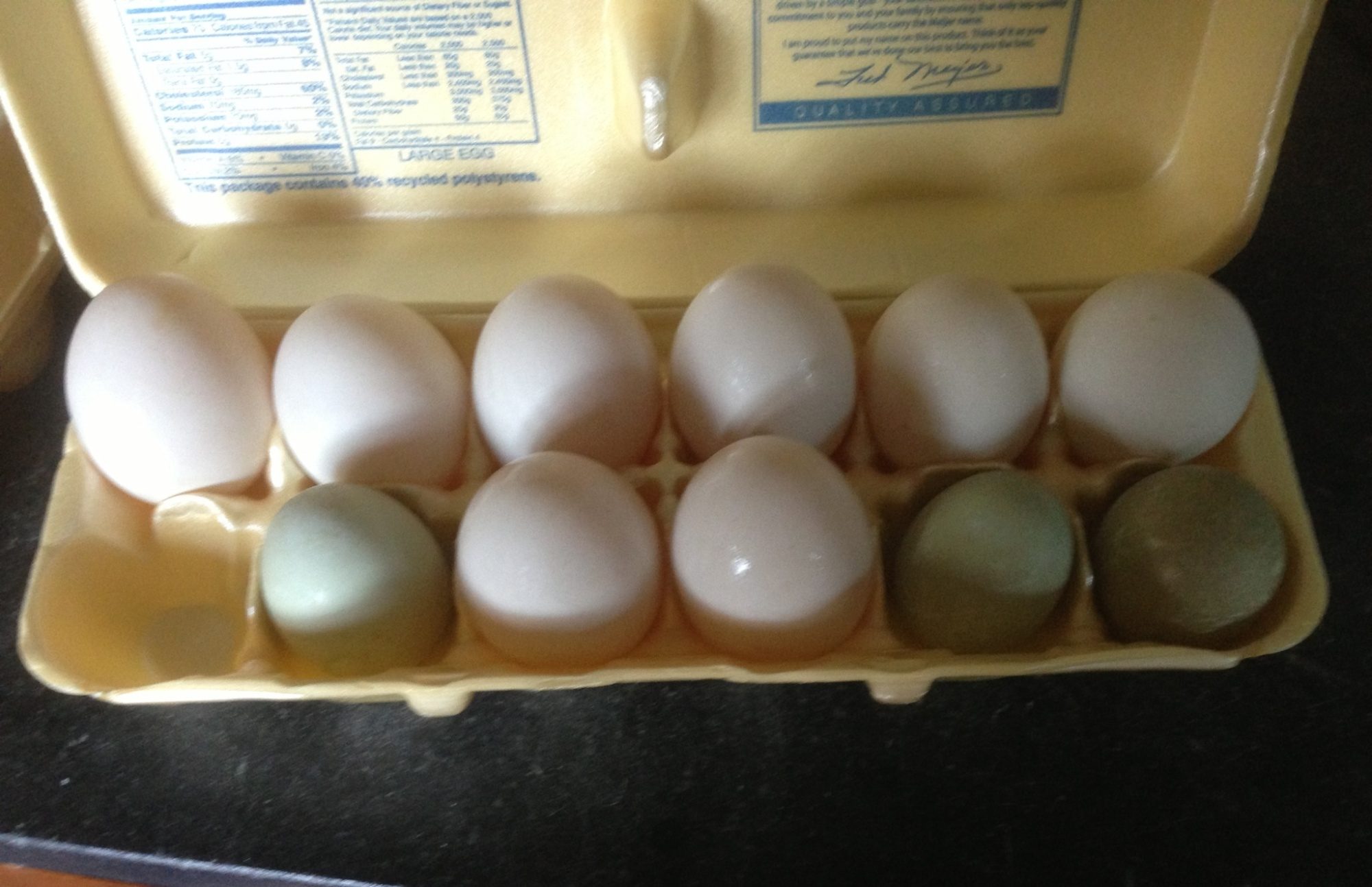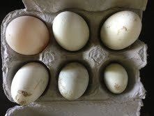 Here's our eggs from last week. The bigger white ones are from my Rouen. Blues are 99.9% sure from my Runner. ... So I wonder if this means she might one day hatch a blue Runner?! How exciting!