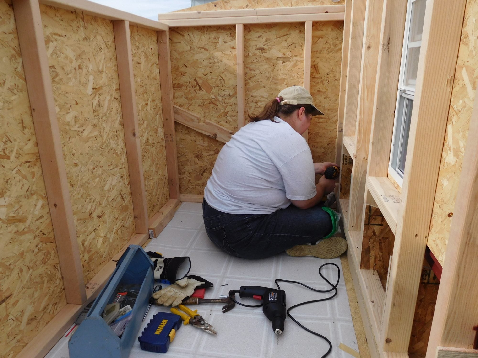 The 2 x 4 roosts fit into precut slots. We put a piece of vinyl flooring in on the bottom. It was a little short on the sides, but I will be taping them down with gorilla tape and cutting 1 x 4's to put against the inside perimeter. This is ALWAYS the best these coops are gonna look, before the birds get to them!