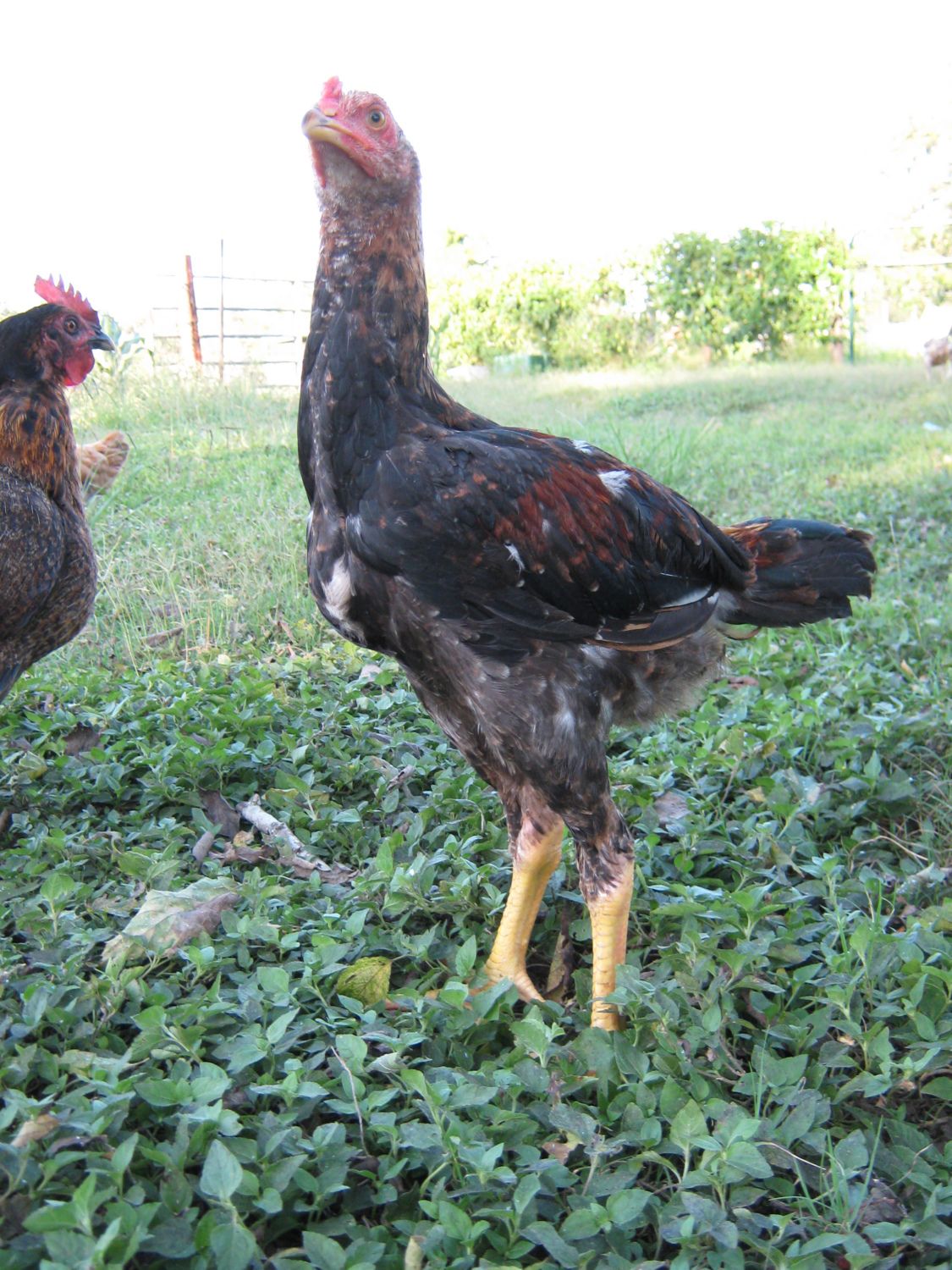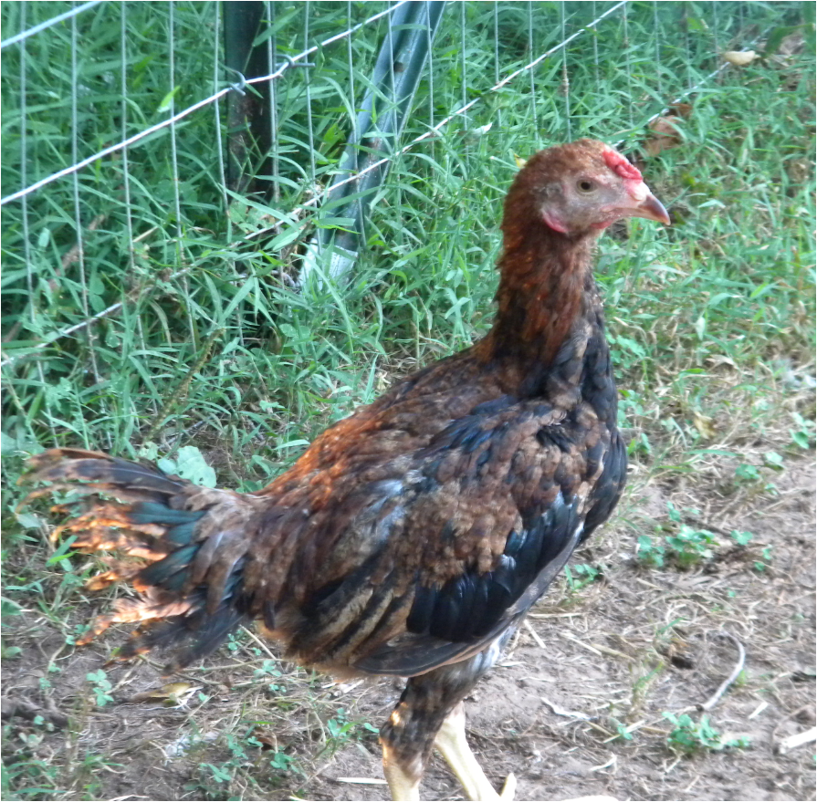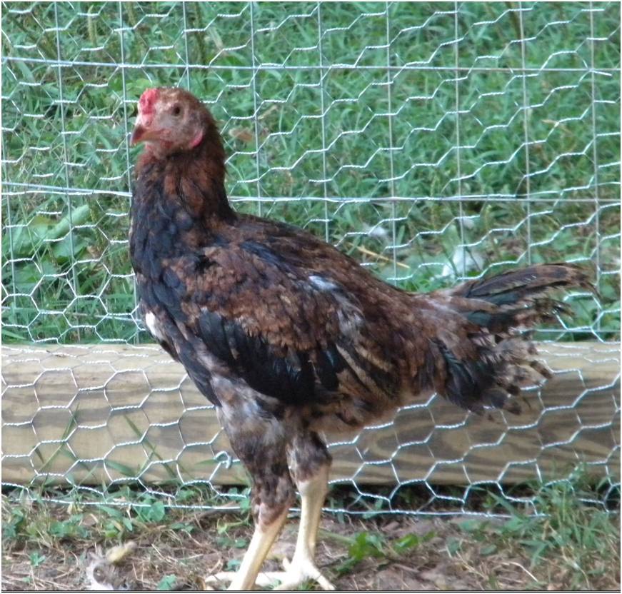 The biggest difficulty this year seems to be getting light colored hens. Most pullets hatched are darker than I would have liked. Just as the Saipans I raised in the past, these Saipans are showing some variability in color. One of my goals is to hatch out 1,000 chicks over the next few years. I was told years ago, that to better understand the genetics of a breed, you need to hatch out 1,000 birds. By mating light colored hens with different colored cocks, I am already getting unusual colors. My favorite bird so far does not look like much like a Saipan.