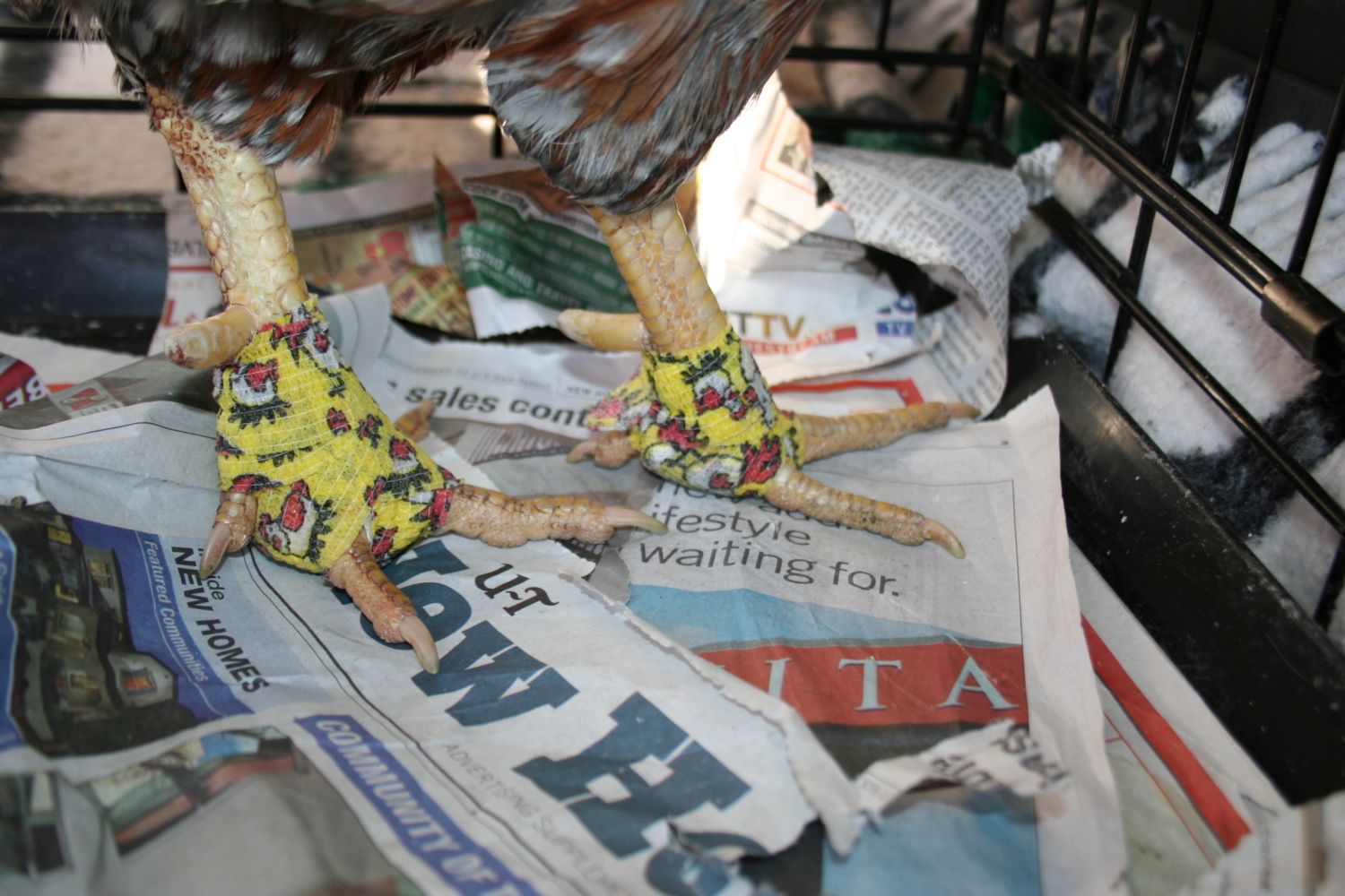 Here are my roosters feet, all bandaged up. The vet said the infection went through his foot. It was a pretty nasty infection. He certainly would die if I didn't bring him in. She opened his foot from bottom AND the top and flushed it out. A hole straight through his foot. Hopefully the infection hasn't gotten to the bone. Meds and daily bandage change for the next 2 weeks. The other foot has a little sore so they went ahead and cleaned it up and took care of that. I think the techs were pleased with their choice of bandages.KKH - when are you taking him in? Sure hope he's okay!![]()