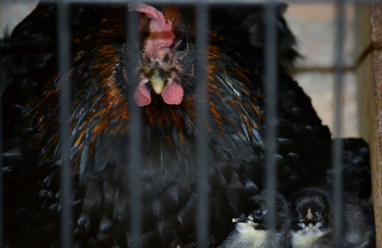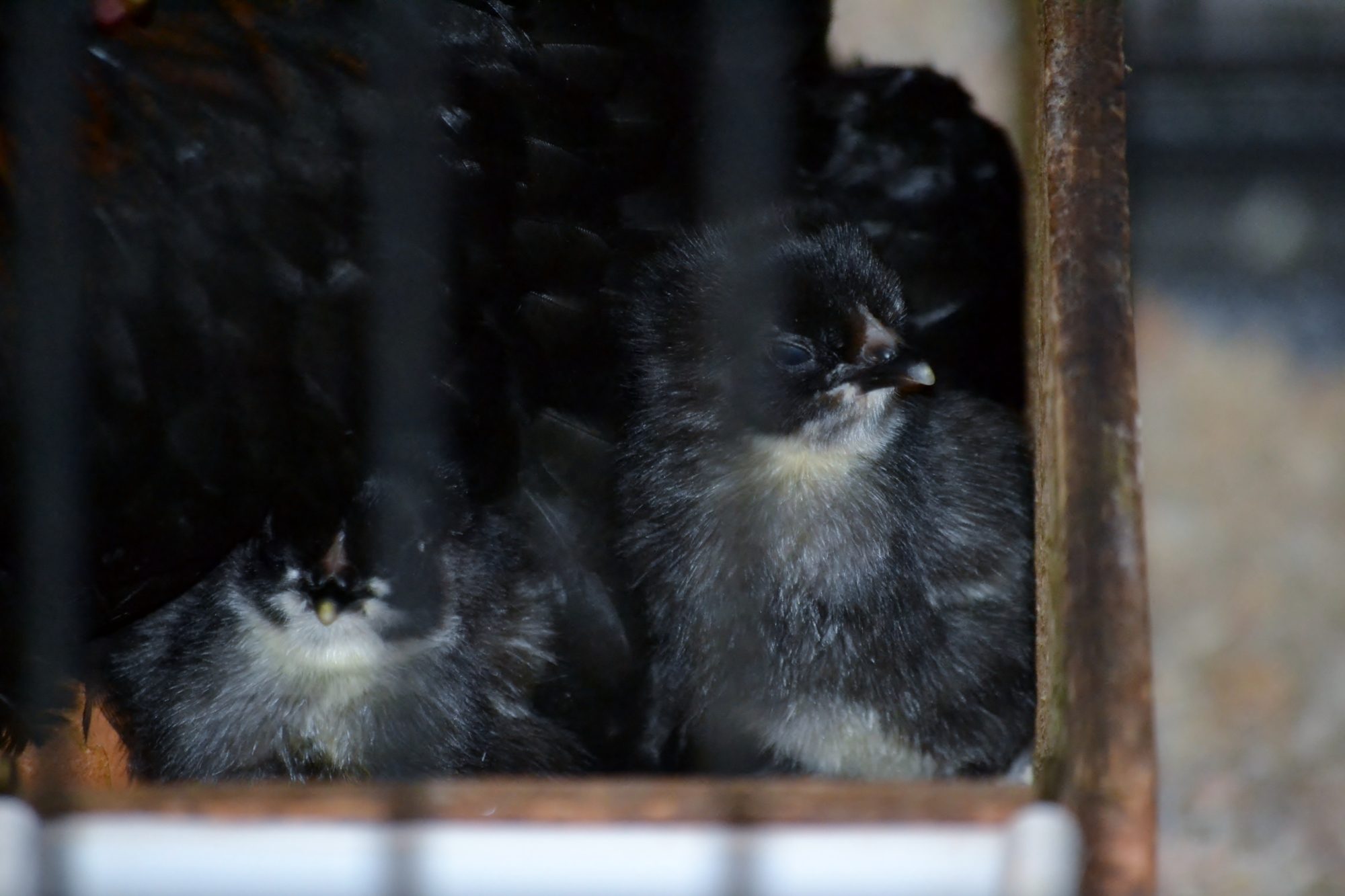 She had eight eggs, but I've only seen four chicks so far... at least one is a full Marans (I saw the egg shell). The other could be a 2nd generation Olive Egger. I didn't want to bug her too much, so I took these with a long lens from far away. Sweet babies!