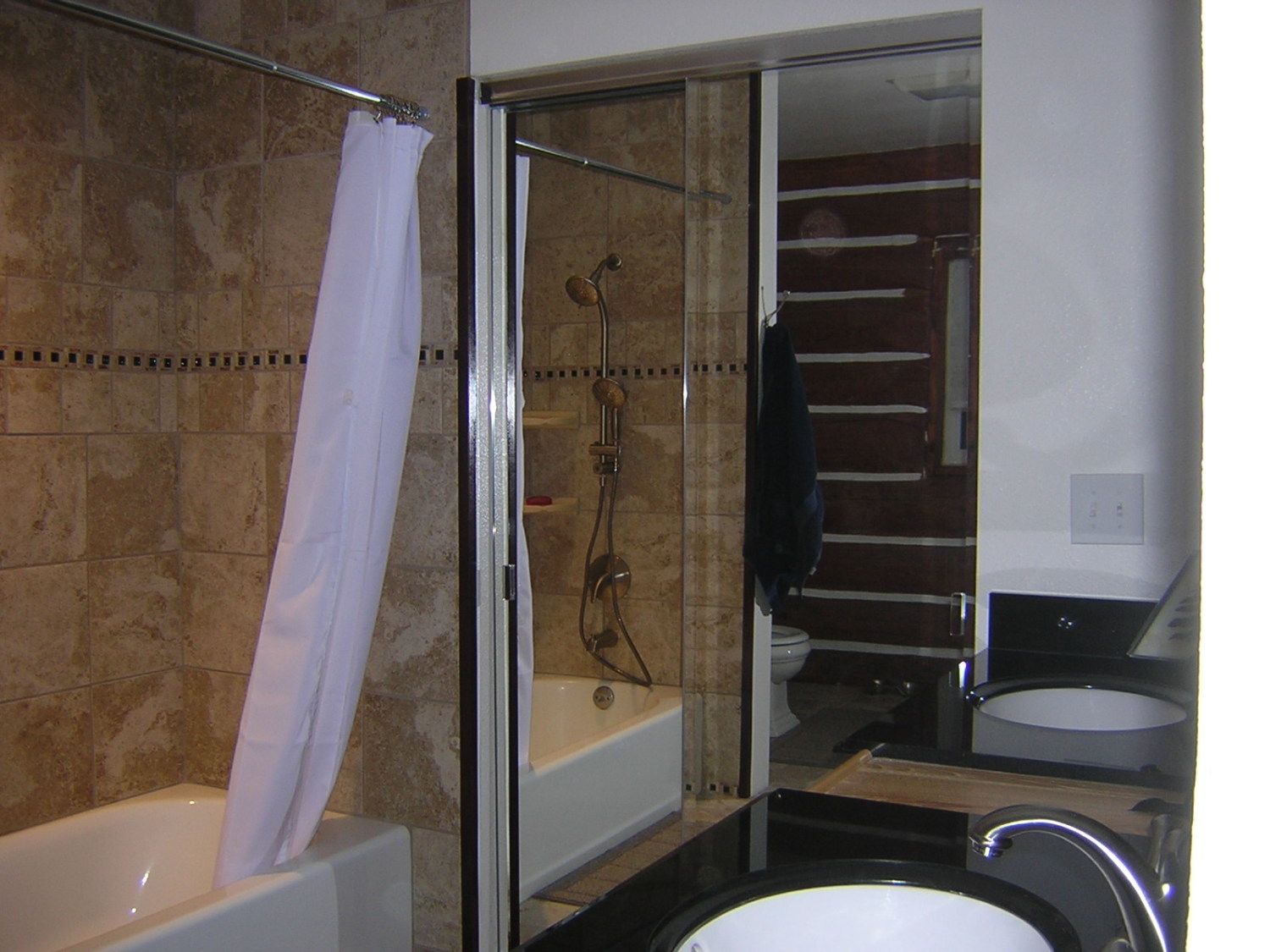 We do still need to purchase and install a proper glass tub door, but until such time as we decide just which one we want, a simple shower curtain will suffice. Dang! Those glass doors are PRICEY!