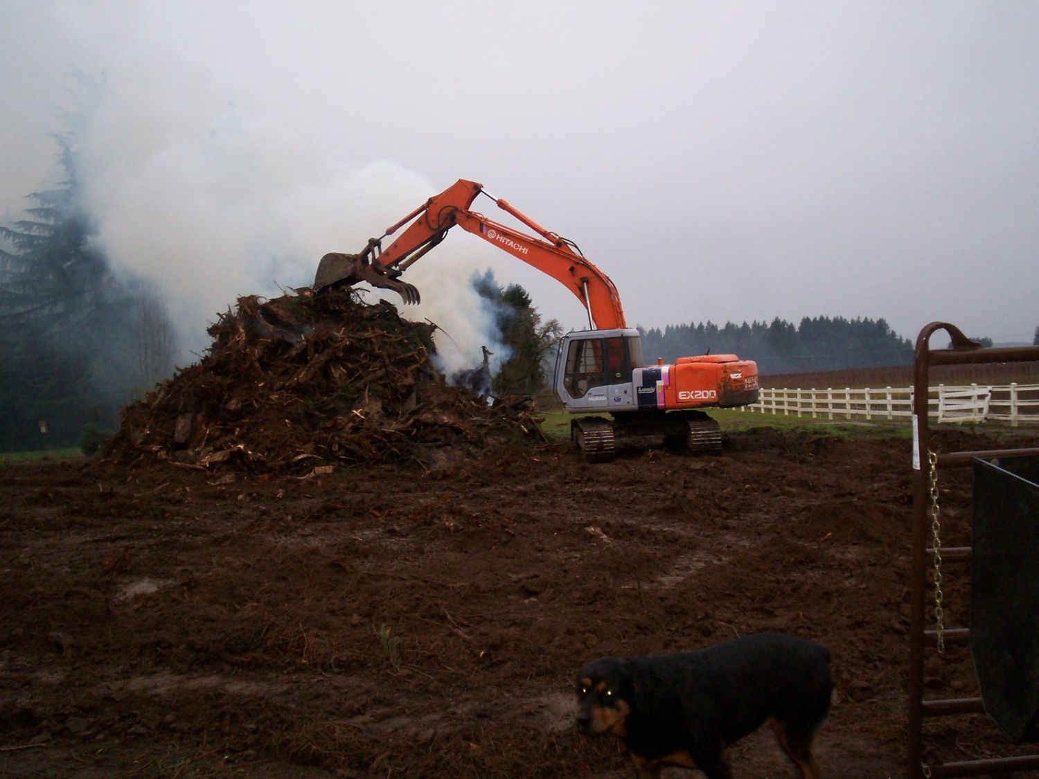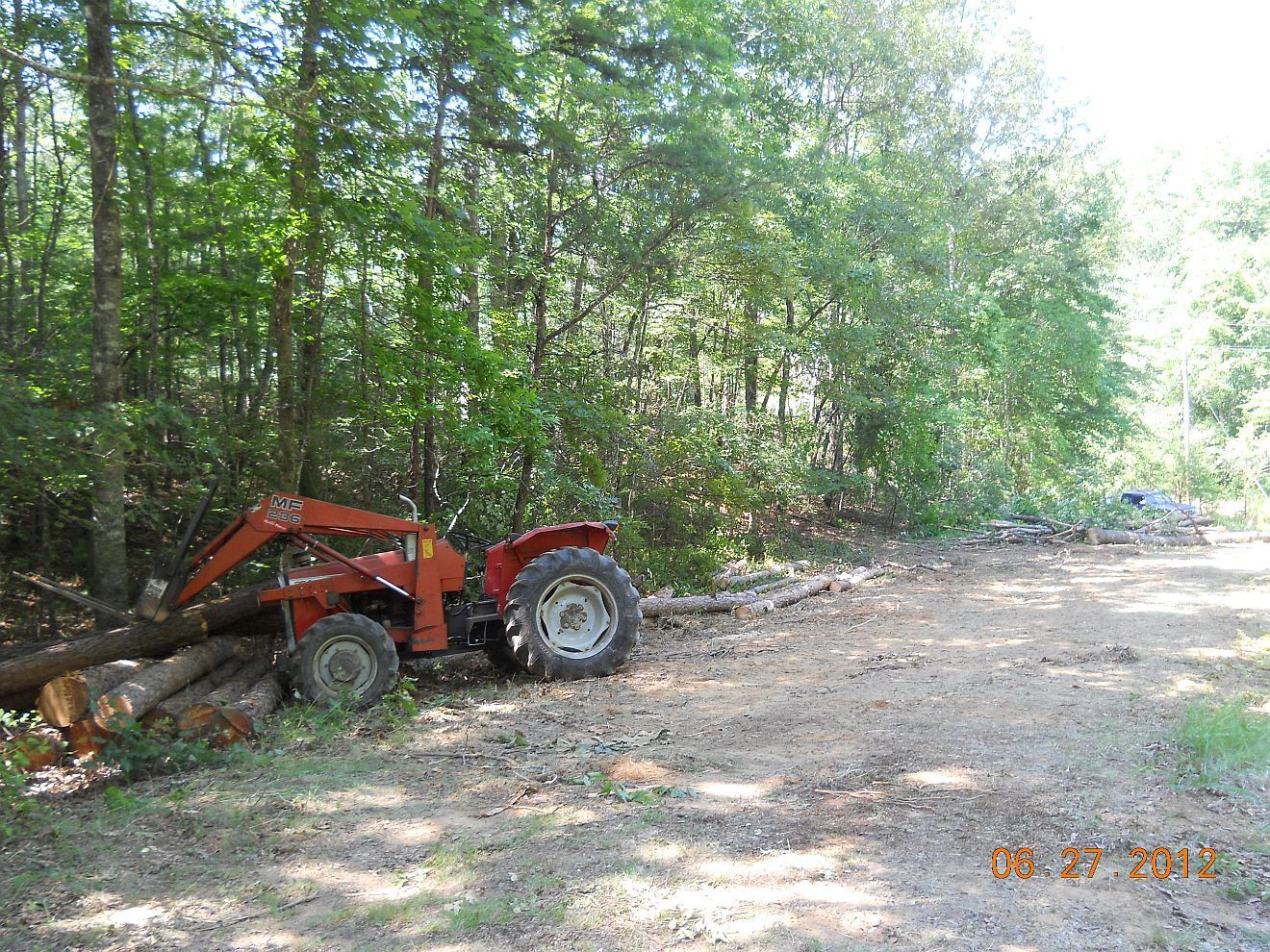You asked for logging pics so here are some. In the first one, the pickup you can barely see at the bottom of the hill is at one of the lower corners of the property, though past the truck on the other corner is lower by a few feet--we told them to start near the bottom and work their way up the hill toward the house, which will give us time to get the back fence removed so they don't crush it. That road is the power line easement road.