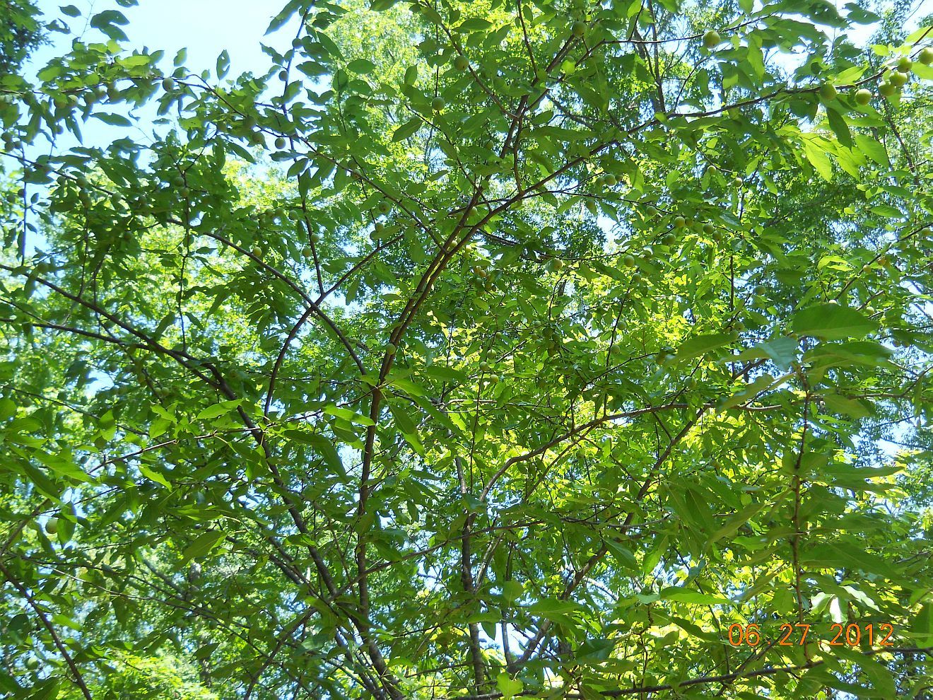 Wild plum tree. They're mostly pit, but really sweet, if you can get to one before bugs or something else eats it. The chickens love them. They turn yellowy-orange