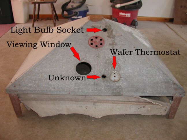 To my surprise the heating element works. It is controlled with a wafer thermostat but the wafer is missing. There is a light socket inside the brooder. Would there have been a light switch in the unknown hole that turns the inside light on & off?
