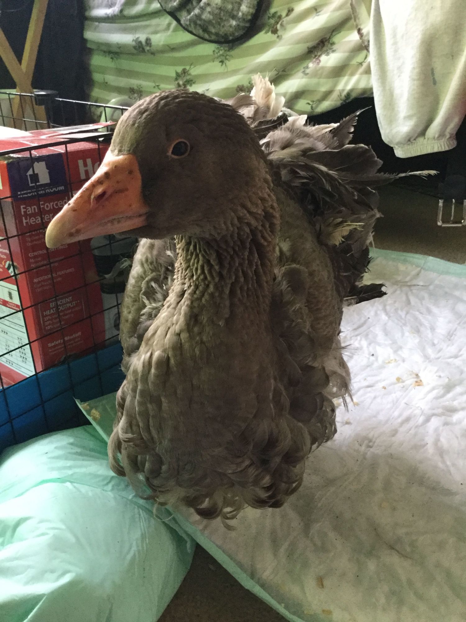So After giving not one, not two but three baths, she is has some NOT a lot of nasty stuff still on her. Looks like she was either in a coop with poop up passed her chest or stuck in some mud. I never got to see her living quarters because when I picked her up she was in a dog crate. Perhaps they didn't want me to see her living quarters. ANYWAY, I have her now, She pretty Awesome this morning now that she has dried most of her feathers.
