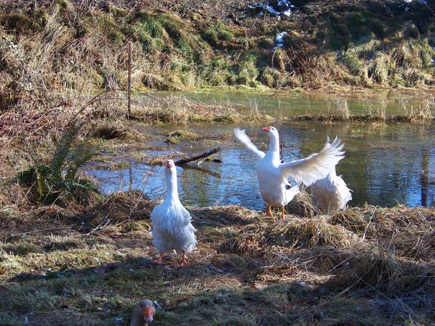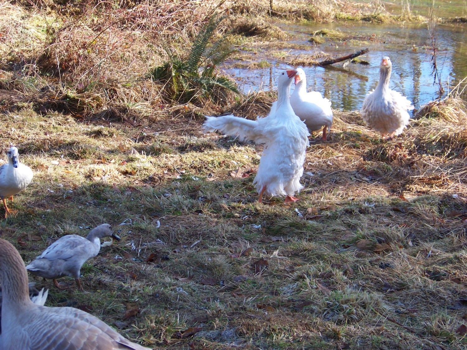 left to right. curly white gander, smooth white goose, lavender goose ( and an ancona hen and a lavender runner hen with the body of my American buff goose)
