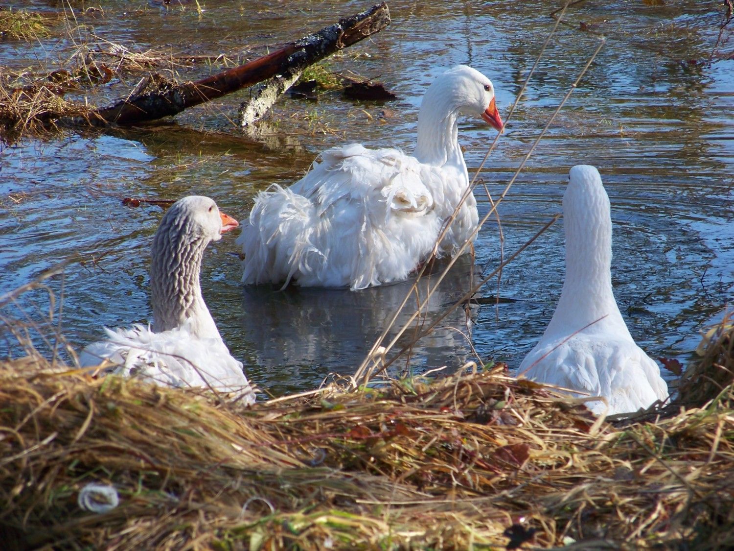 front to back. head of my American buff goose, curly white gander, smooth white goose body of lavender goose