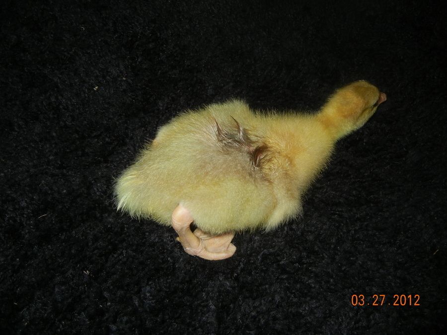 BTW-when I hatched a seb gosling last year, he did that same thing when he kept playing with the feathers on his back. We thought maybe the heat lamp was too hot on his back? We washed him off with warm water and he stopped doing it. Not sure what caused it though.