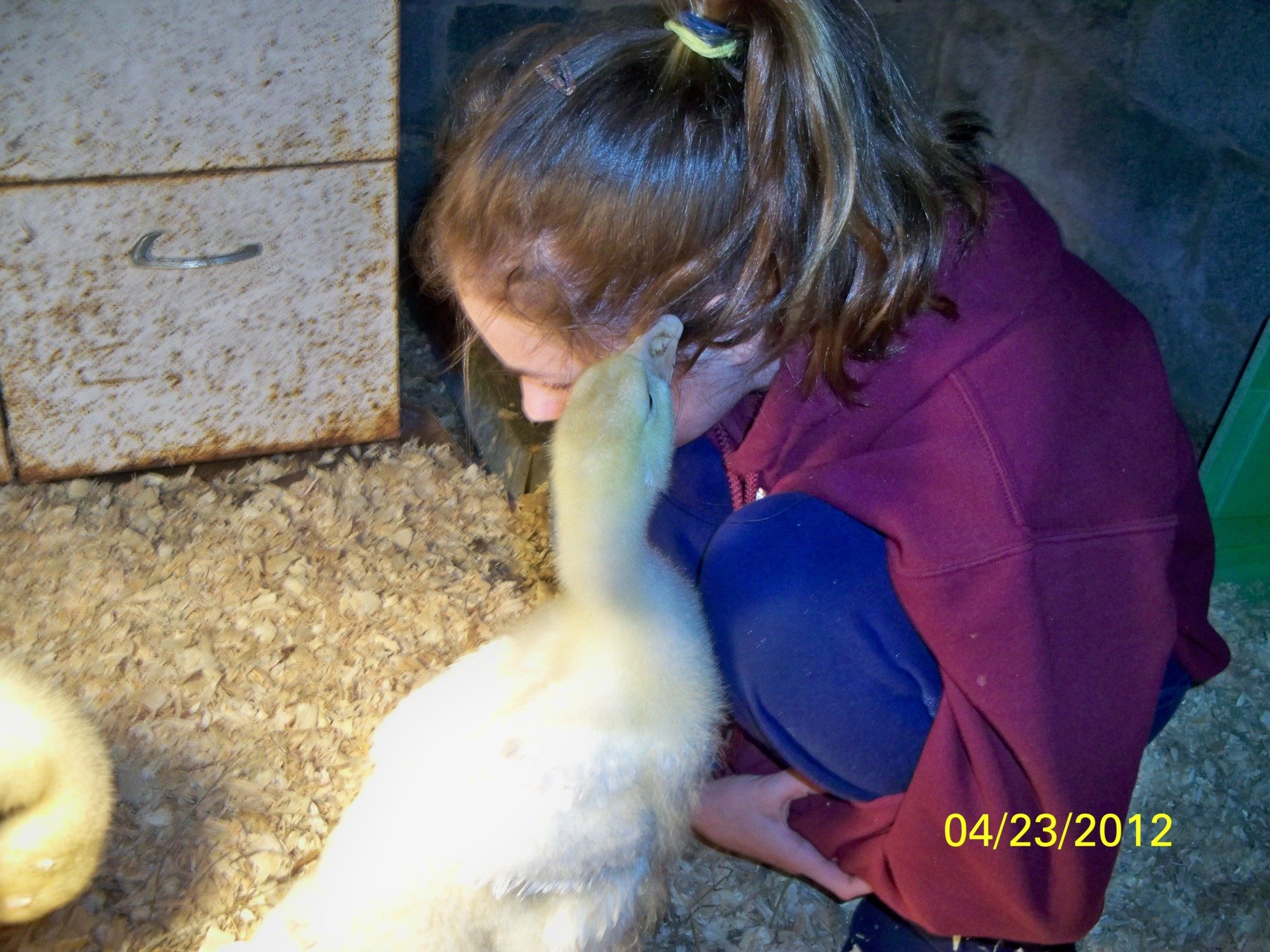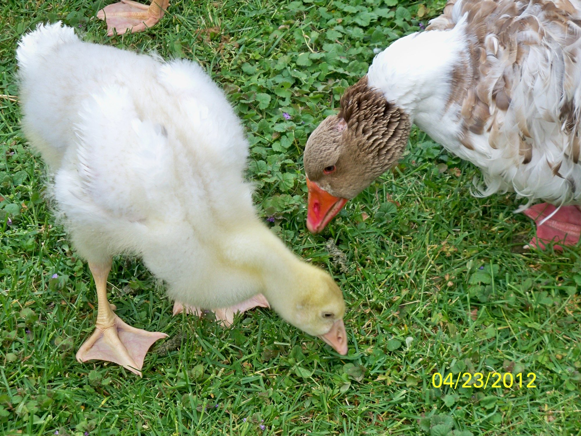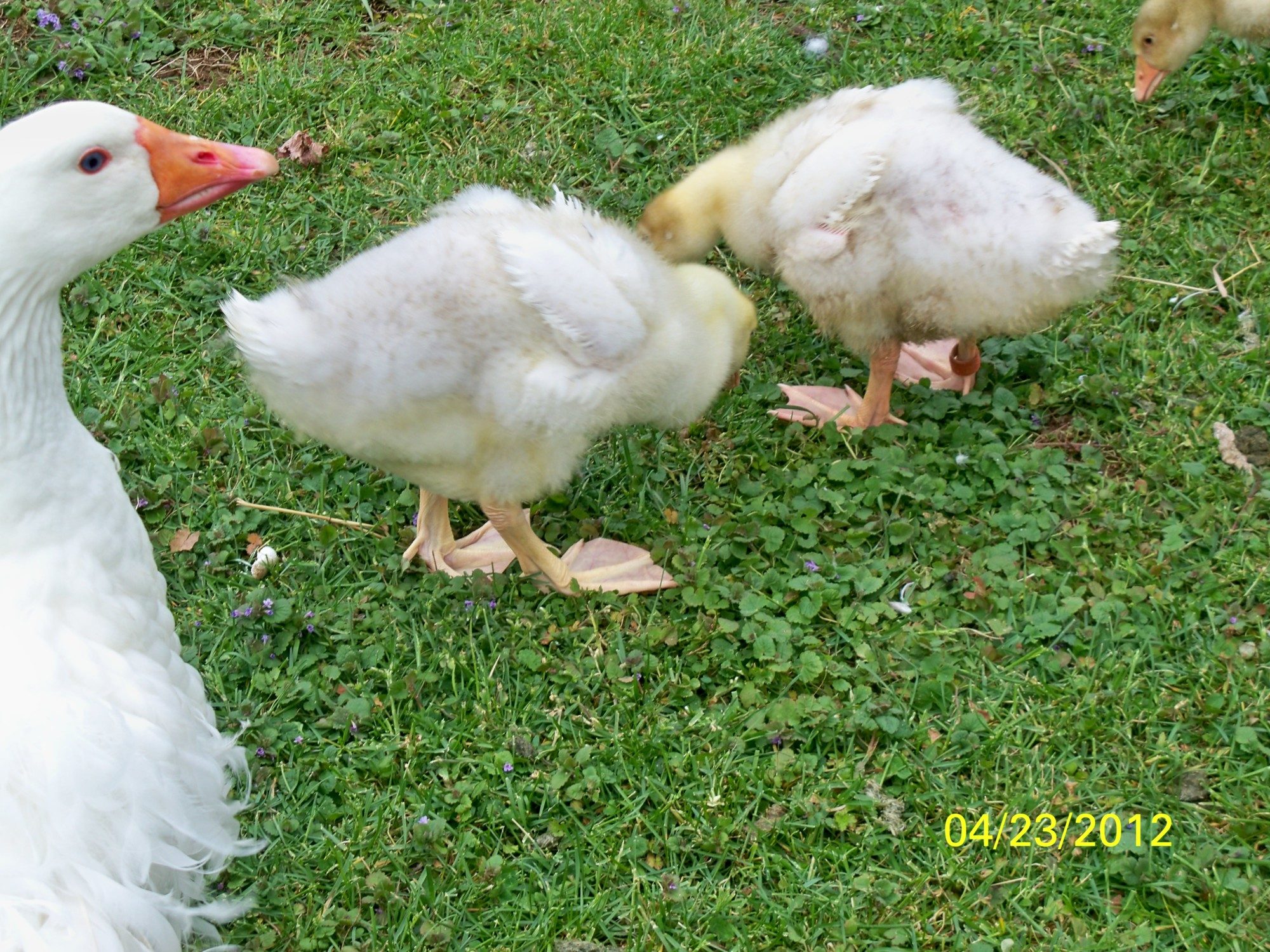 ohhhh look who we brought home today!!! A brother for my 3 girls! I was selling Sadie's eggs to Becky already and yesterday I saw that she had a lone gosling male for sale. Well, my brain started thinking of how we could work that out and bingo...TRADE popped into my mind and today it's done! He's a love, and he hatched on the exact same day as Sasha, Sophie and Scout! 3/29/12 is a lucky day I guess and now he's even showing some grey feathers growing in, despite Becky thinking he'd be all white. He got to hang out in our grass pen for a few hours, and we just about had to drag them out of the grown ups' overnight pen, but once they got out, they ran across the backyard following my DD to their overnight heated shed. He's in there and cuddling with the 3 girls. He loves to eat hair, and we love him already. He's so sweet, and Becky, if you see this, you did such a great job raising him to be such a sweetheart! I caught Sasha and him (Simon) resting up against each other about an hour after I got him home, and her head was on his neck....so adorable!