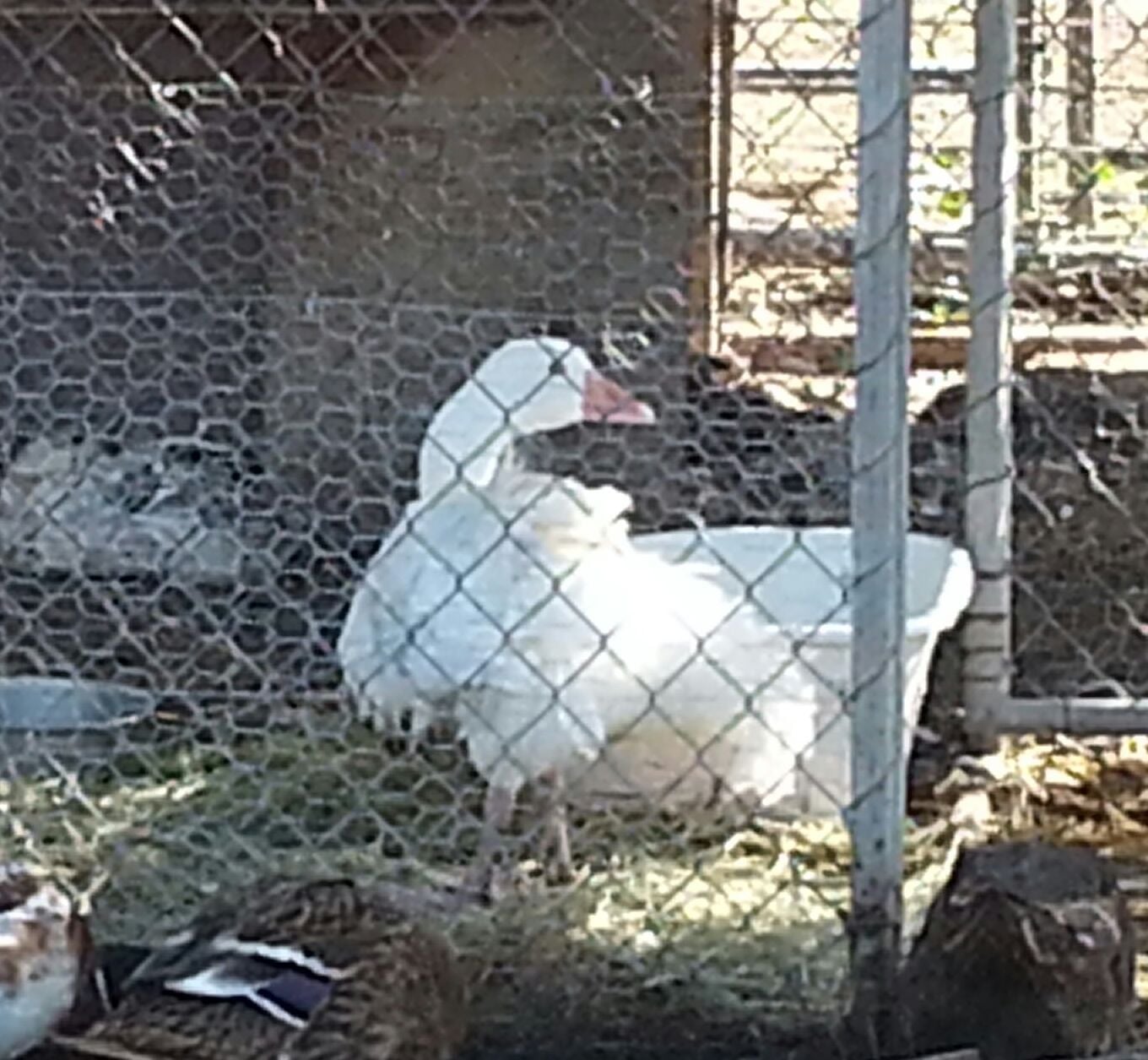 Albert stays in her pen a lot because the other geese will gang up on her if I let her in with them. Have to put them in another fenced part of the yard to let her out. I can tell she really wants to be with the other geese. I let her out with 3 of them yesterday and all was ok for a short while. Soon two were attacking her again. With her physical issues she cannot run fast and yesterday she fell over on her back. I had to go get her and set her up straight. My goal is to assimilate her into the gaggle as soon as possible. Right now one of the other geese has goslings and so there's no moving the whole group to the other fenced area so Albert can get out of his pen for a few hours a day. :/