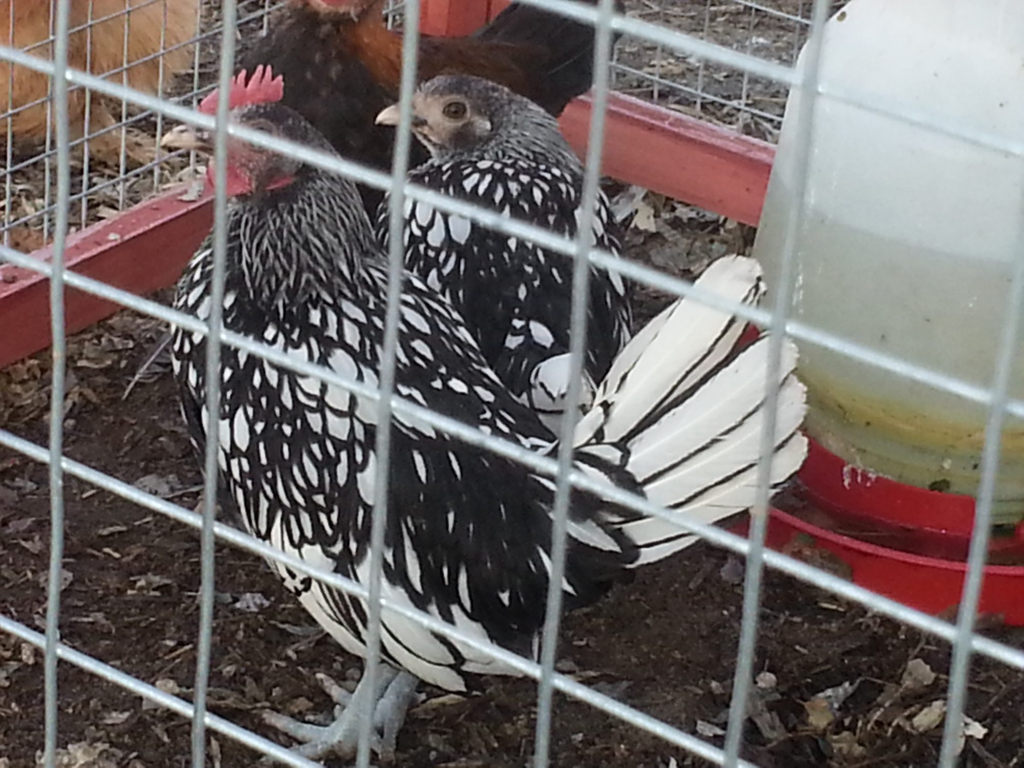 I think you will enjoy them. I have one Silver rooster, two Silver females and two Golden females. They are about the size of a pigeon and are one of the few "true" Bantams which just means that they exist only as Bantams and that there are no Large Fowl equivalents to them. Also the Sebrights are the only ones where the male and female have identical feathering...the female is just as beautiful as the male (or the male is just as plain as the female if you can consider that marking as plain). My Silvers lay little small pinkish eggs and the Goldens lay equally small white eggs. I have noticed that the females have their own unique "egg song" that sounds very much like a Peacock. The rooster has a comb which the females don't develop. However the hint of comb on the female will become much redder when they mature and start to lay. My rooster will spread his tail open and use his wings to thump his chest making a poping sound and crow. They do crow a lot.