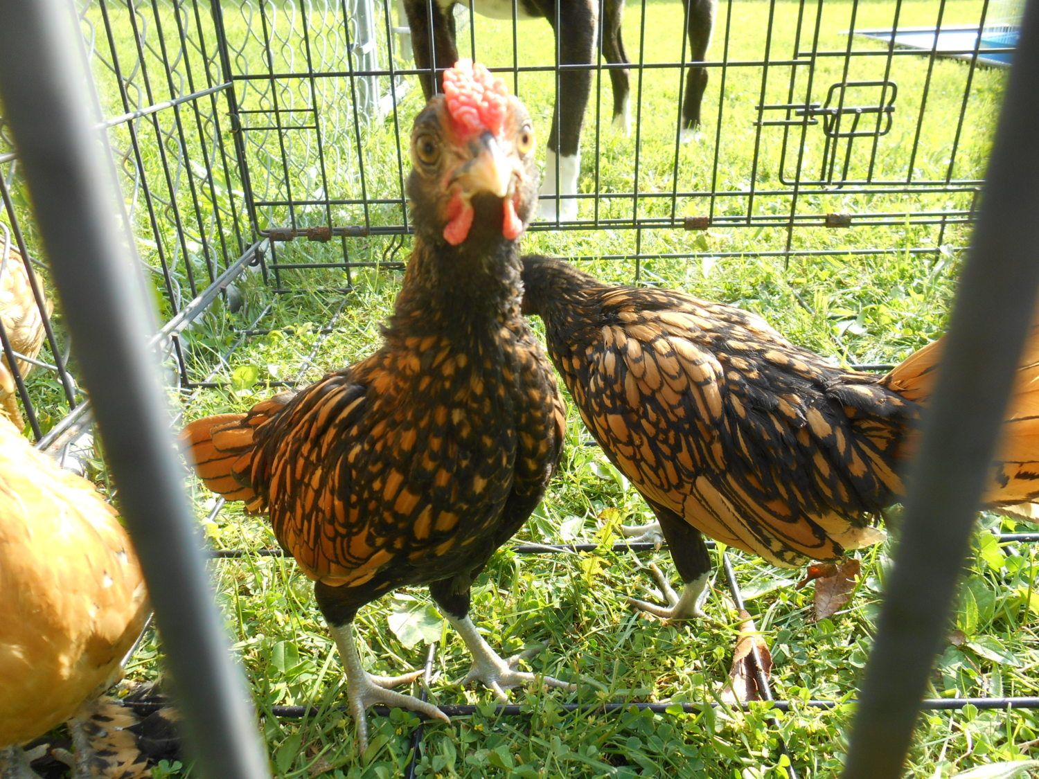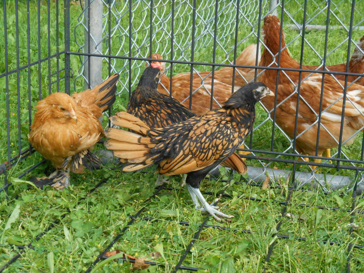 I have been told that 2 of them are Sebrights. They are not exactly tame and are not doing well as semi-house chickens. There are dogs, vacuums, and electric lights here. When we turn off the lights and go to bed it's "chicken freak out time" for 20-30 minutes. The other 4 chickens are totally unfazed by vacuuming, dogs or lights going off. They also really do not like daily handling - I do not yet have satisfactory out door chicken housing so they spend the night inside.