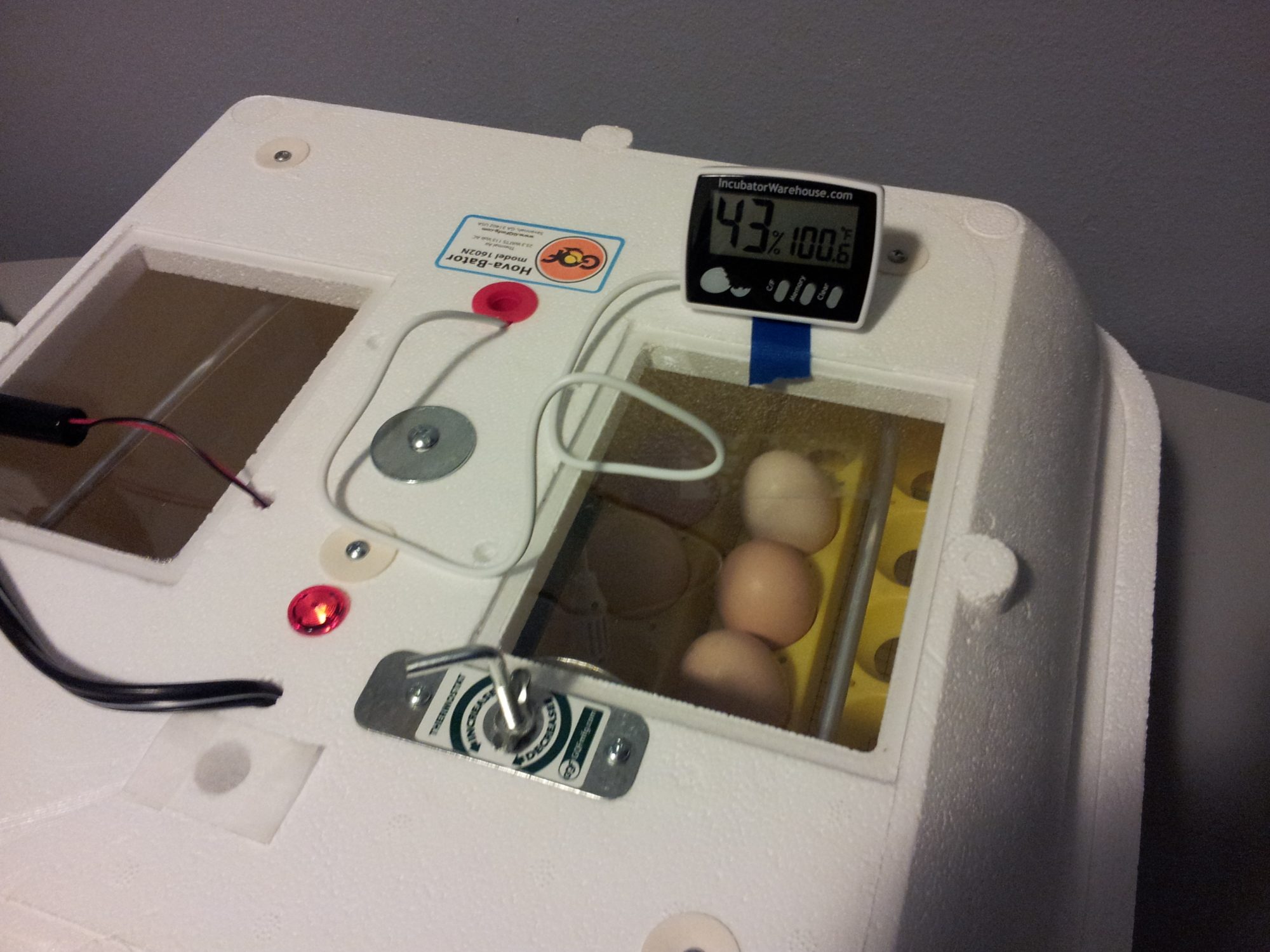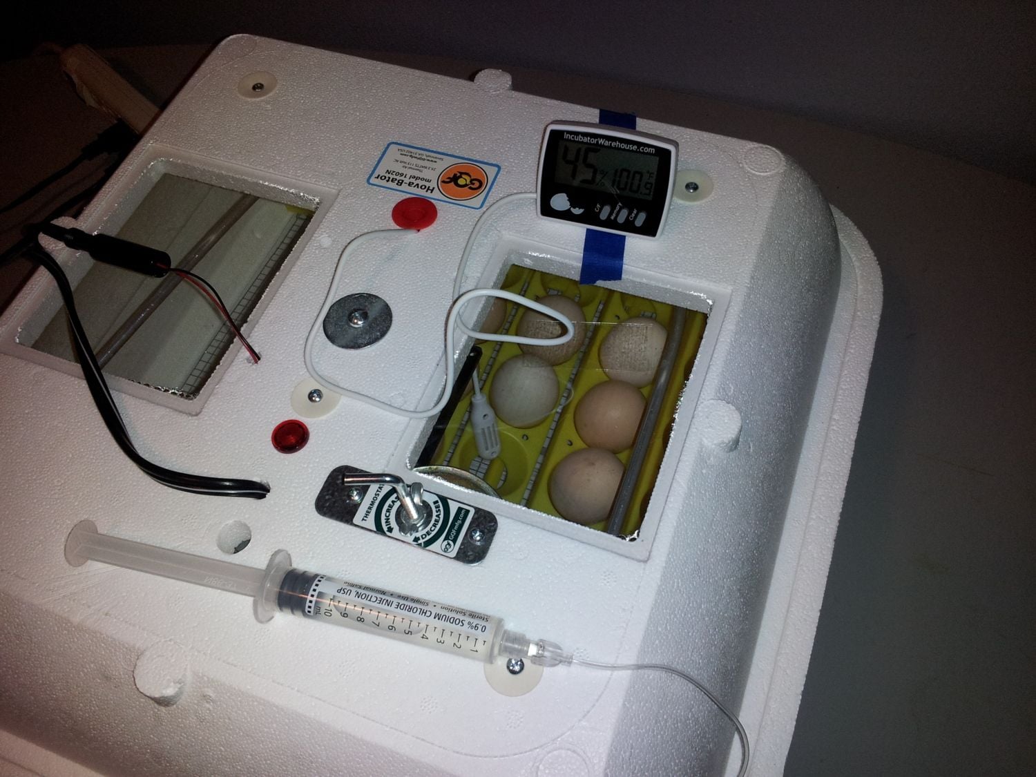 Below is a picture of how I am planning to regulate the humidity without opening the incubator. I have strung a syringe pump IV line through one of the vent holes of the incubator and taped it in a position to drain into the water wells. To increase the humidity, all I have to do is inject water via the syringe into the incubator wells. In the last 3 days I may need to add a second IV line into a second water well to up the humidity to 60+%. So far it works great.