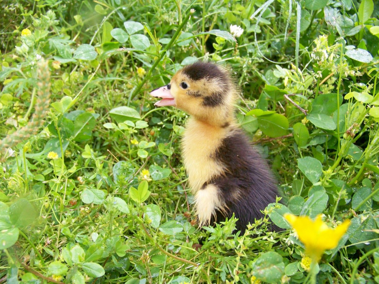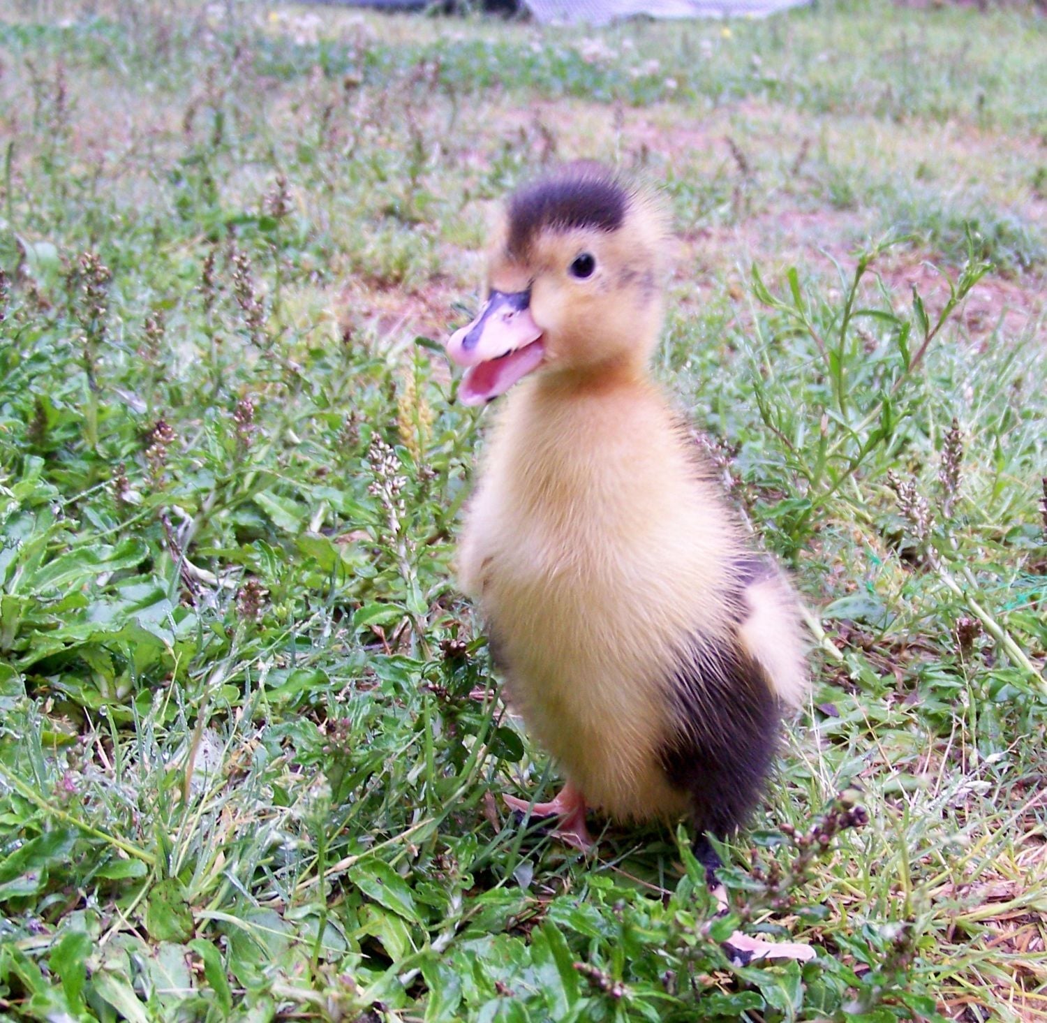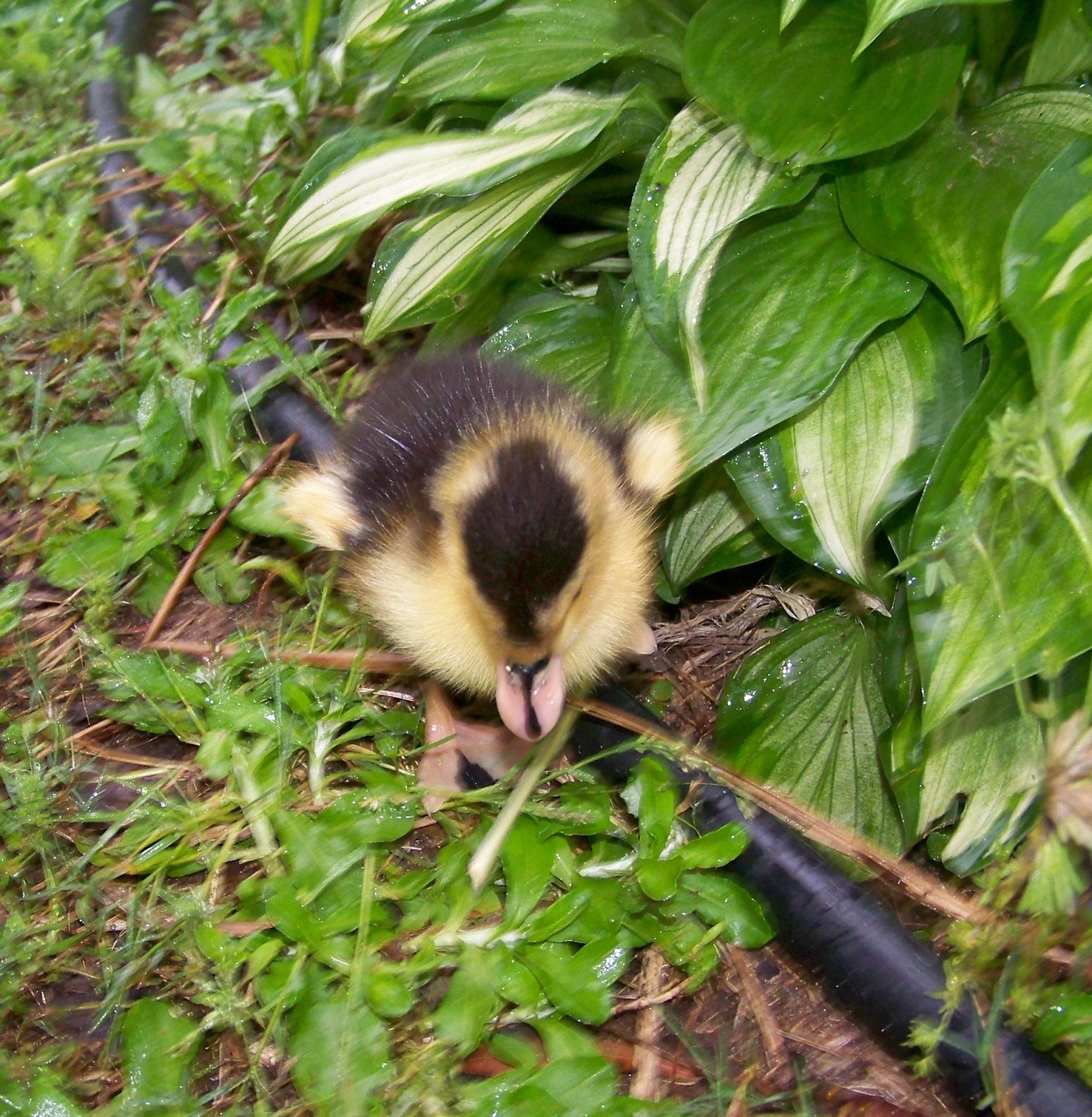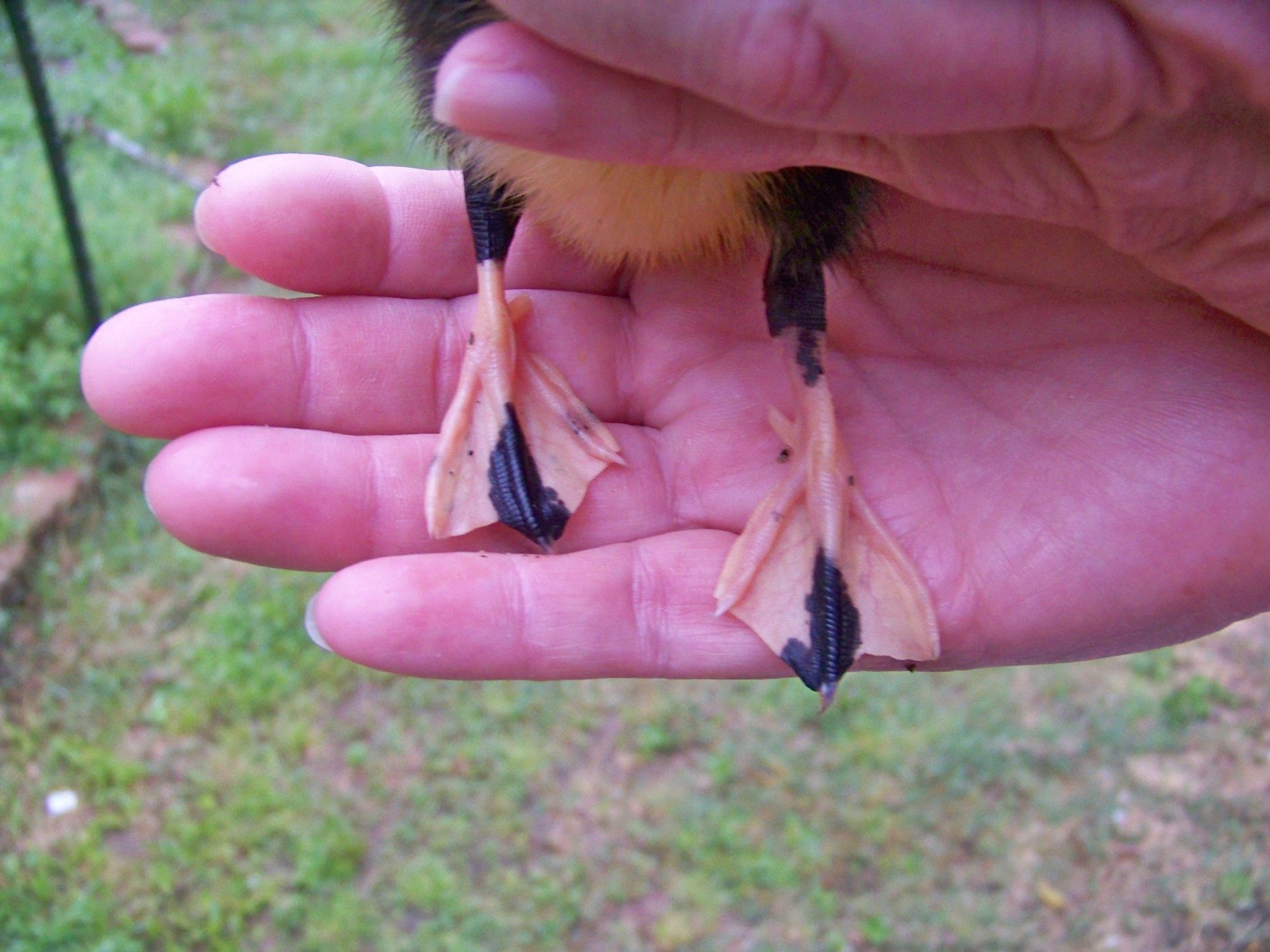 I picked up a duckling at the feed store today as a buddy for the one I hatched from Jess's eggs. It is all yellow on the bottom, stomach, and chest; and all black on top. He has a black stripe down the center of his bill and a couple of black spots on his feet. Anyone know what kind he/she is?
