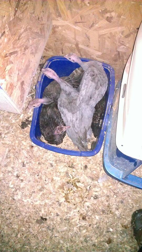They are finally in the coop with the rest of the birds. Because they had the cornish with them, who adamantly refused to feather out, they just went out (and the cornish are still sadly mangy). The BBWs and their cornish tutor went out today into a cage and will be released Saturday AM or Friday at bedtime. Anyway, I went out to the coop tonight to put everyone in and could not find my CdM poults. I eventually located them:
