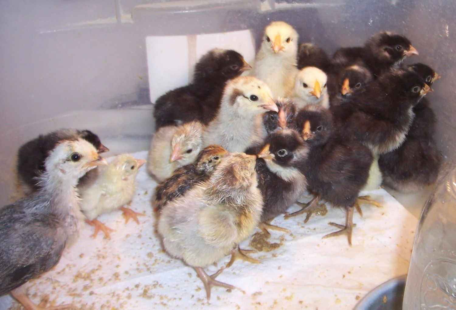 Here they are moved into the brooder with some week old chicks and a 2 week old Bantam.