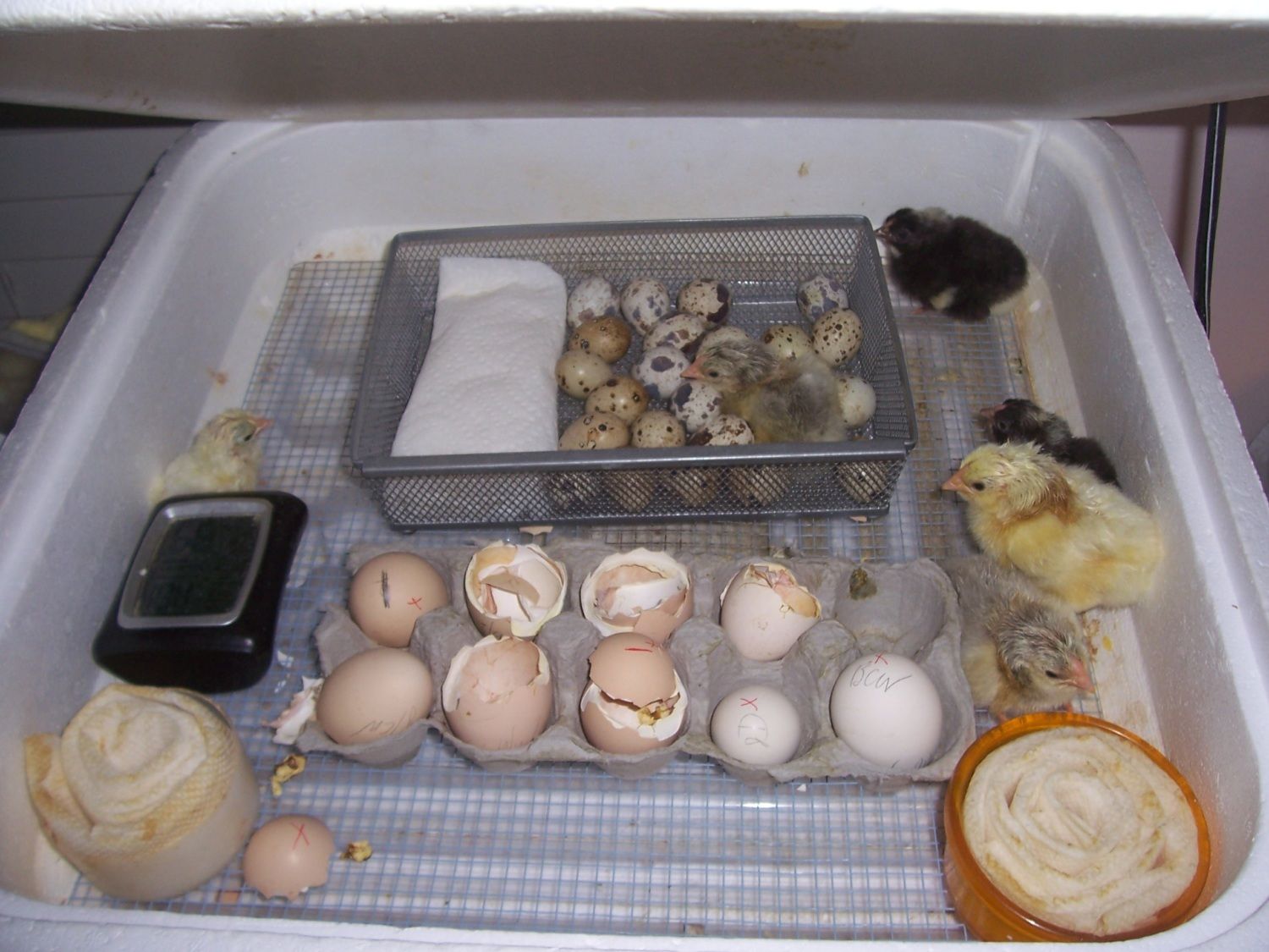 My chick began hatching thru the night. Out of 16 set, 9 went into lockdown and only 6 hatched. One was dead in shell and two were quitters. The Delaware Bantam chick is behind the digital monitor. Only 16 quail eggs made it to the hatcher. They should begin hatching tomorrow. Instead of sponges, I use little containers with rolled up papertowels. I can keep them wet by using a syringe to squirt water thru little holes in the top.