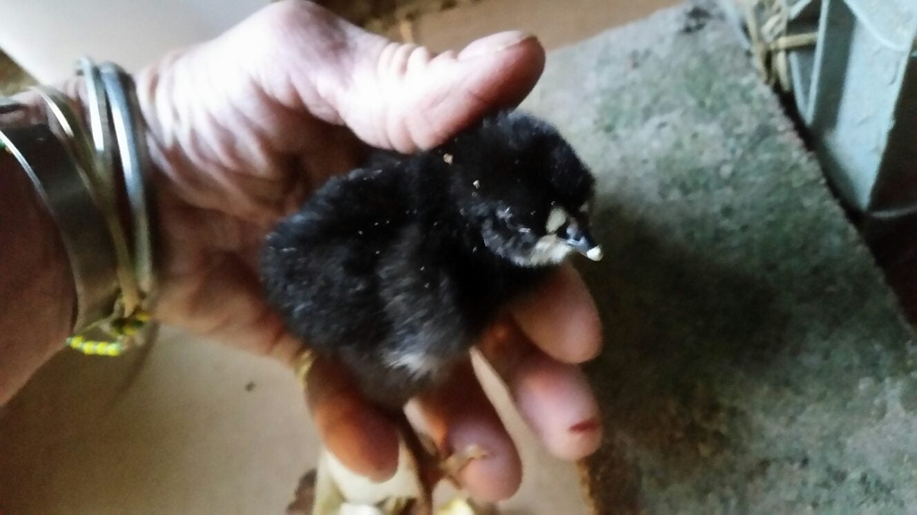 The next egg to hatch right after, it had to have been, the 2nd, looked to be another Henrietta egg. I held the chick for one or two seconds but put it back quickly too. It was still wet and adorably sticky ;-) Black and white coloring that may be more speckly but hard to tell with the sticky hairdo.