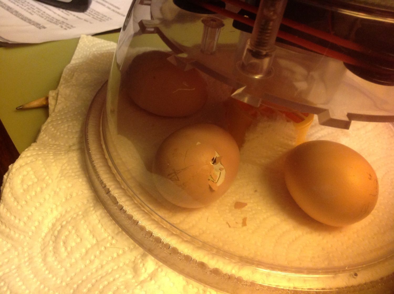 Started with 8 silkie eggs, 1 was not fertile so went in the bin. Got 7 now all wiggling away happily :-D
