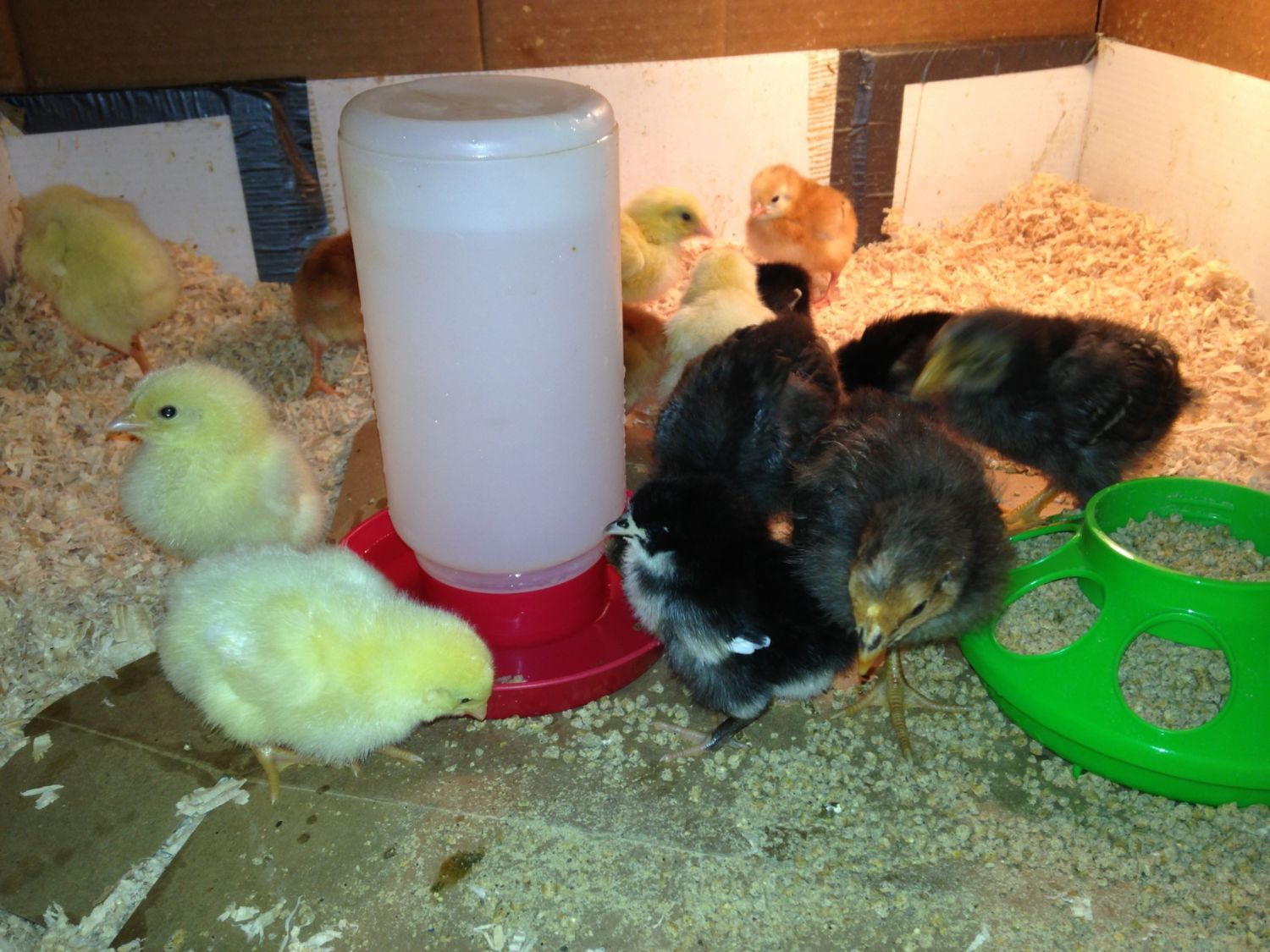 Well I went into my local feed store D&B simply for a bag of horse grain and guess what? They had chicks!!! So what do I do you might ask, well grab a box of course and start loading them up lol I ended up walking out of there with 3 Rhode Island Red pullets, 3 black australorp pullets, and 6 Cornish cross (I think there are 3 pullets and 3 cockerels). Now I have 15 chicks in my bedroom and 8 ducks in a brooder on my front deck.
