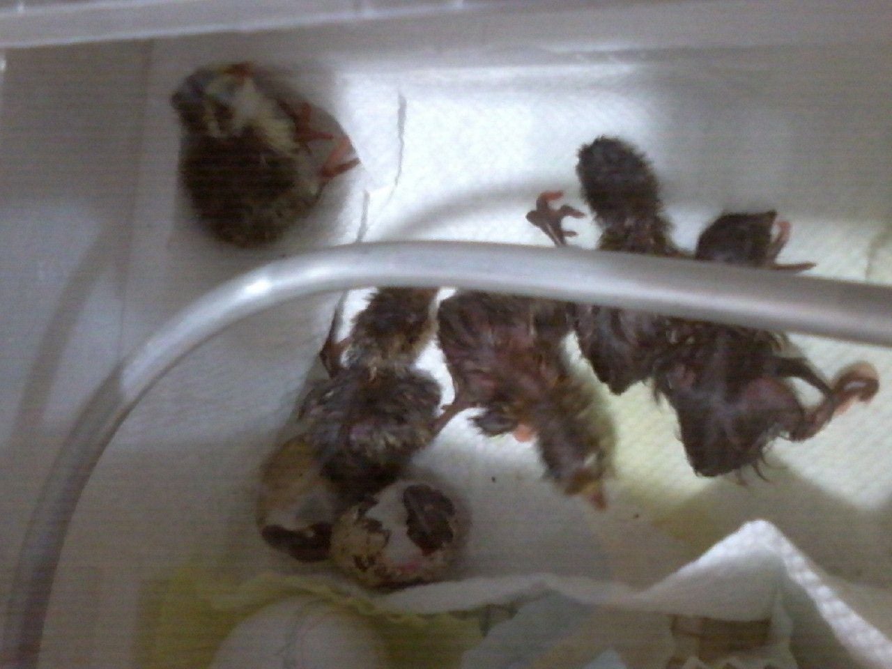 I'm actually hatching these for a friend. She keeps them outside when they are bigger. Not sure what she is planning on doing with this batch. I've got 5 already completely hatched now and 2 still working at it. These two have spots of blood on their shells though.
