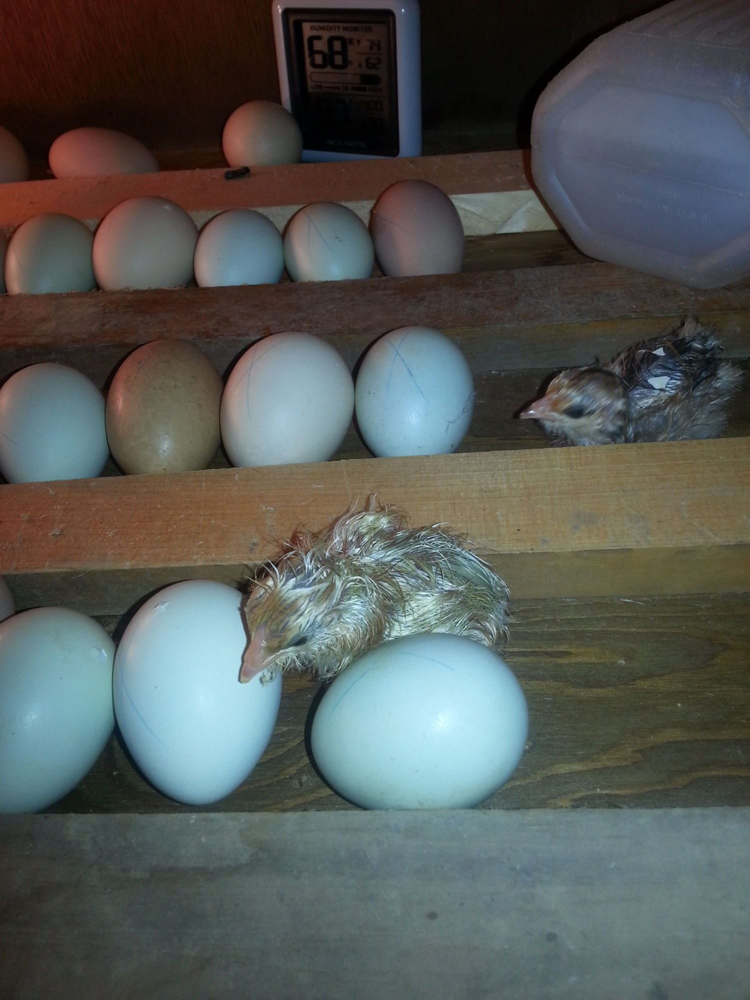 Quote: use the old one from your friend to keep the eggs that don't need to go to lock down...rig it with a light bulb to hold the temp...then use the one that works correctly for the hatch...cause you do need to monitor the humidity for those 3 days! look on line to get an idea for the light bulb....I think it'll be easier to keep the ones that don't need to lock down at the right temp that way! anyway think about it![]()