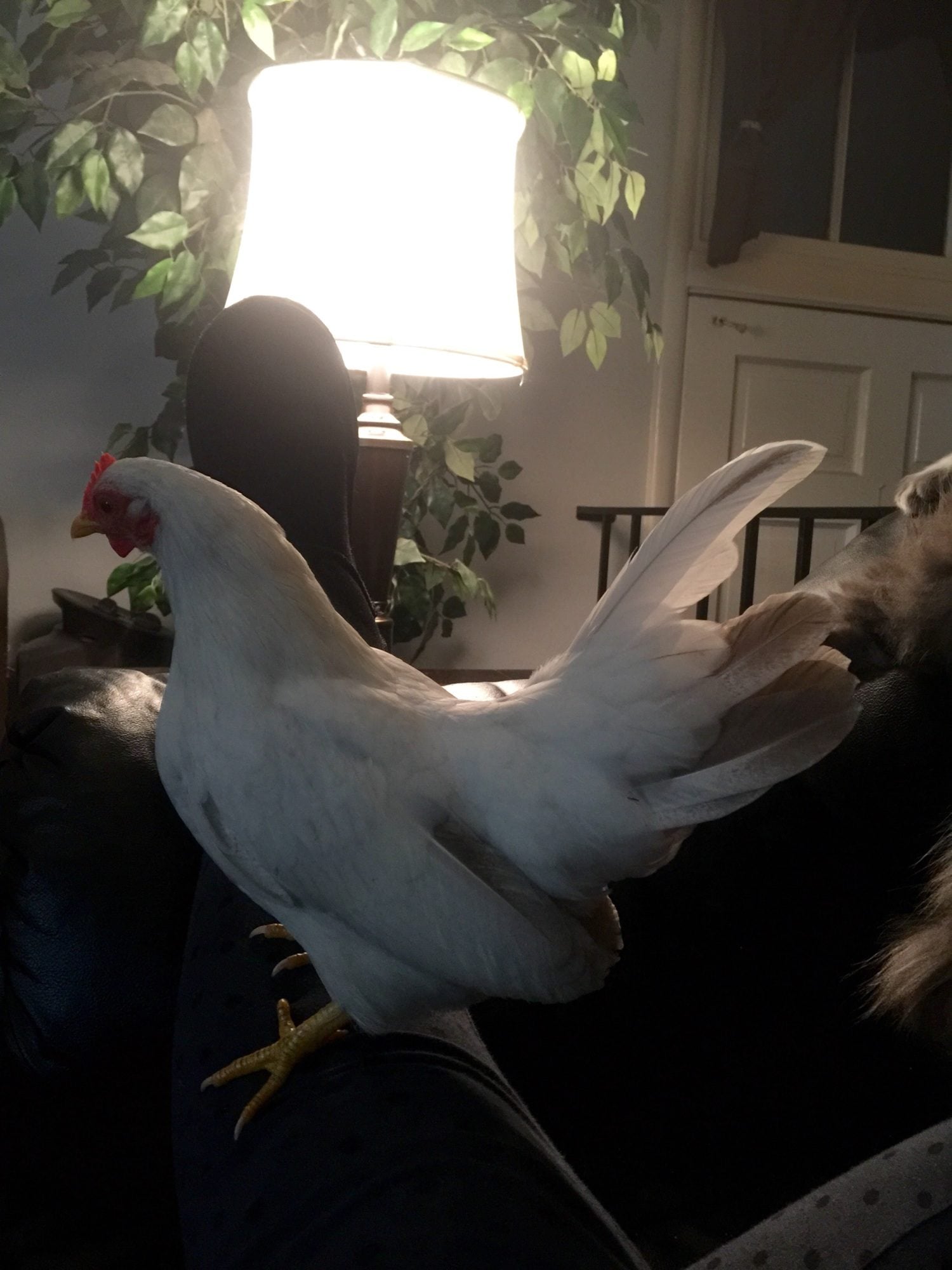 I hatched one Serama at New Years and he was a bit ahead of the silkies I hatched so he was loud and kept me awake so I gave him to a little hen. She wasn't even broody but she adopted him. It has been almost 3 weeks now so she was getting a bit ancy and wanted to go outside but kept leaving her baby behind so I brought him in and chick sat most of the day. We took a nap together and he sat on my shoulder while I did stuff. He even took a little nap on the cat's back. These little birds are just so precious.