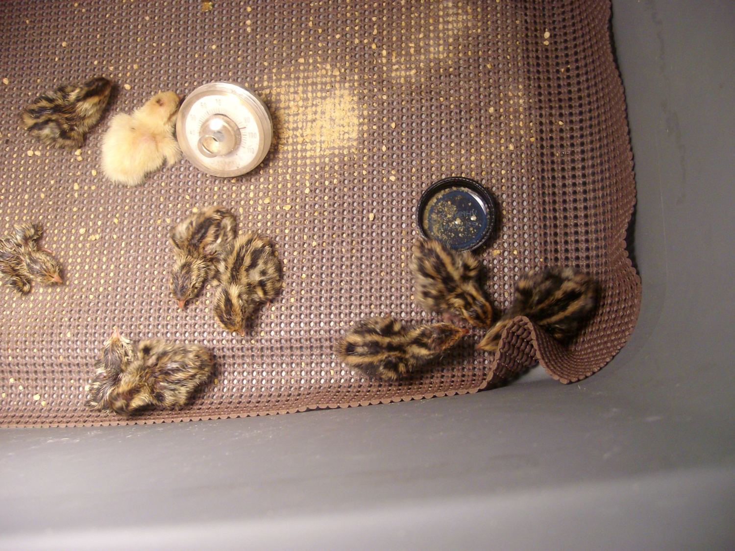i now have 20 quail in the brooder and one running around in the bator and few that zipping. here are few pictures i took. i order jumbo brown but i think i got 2 texas a&m quail in the mix.