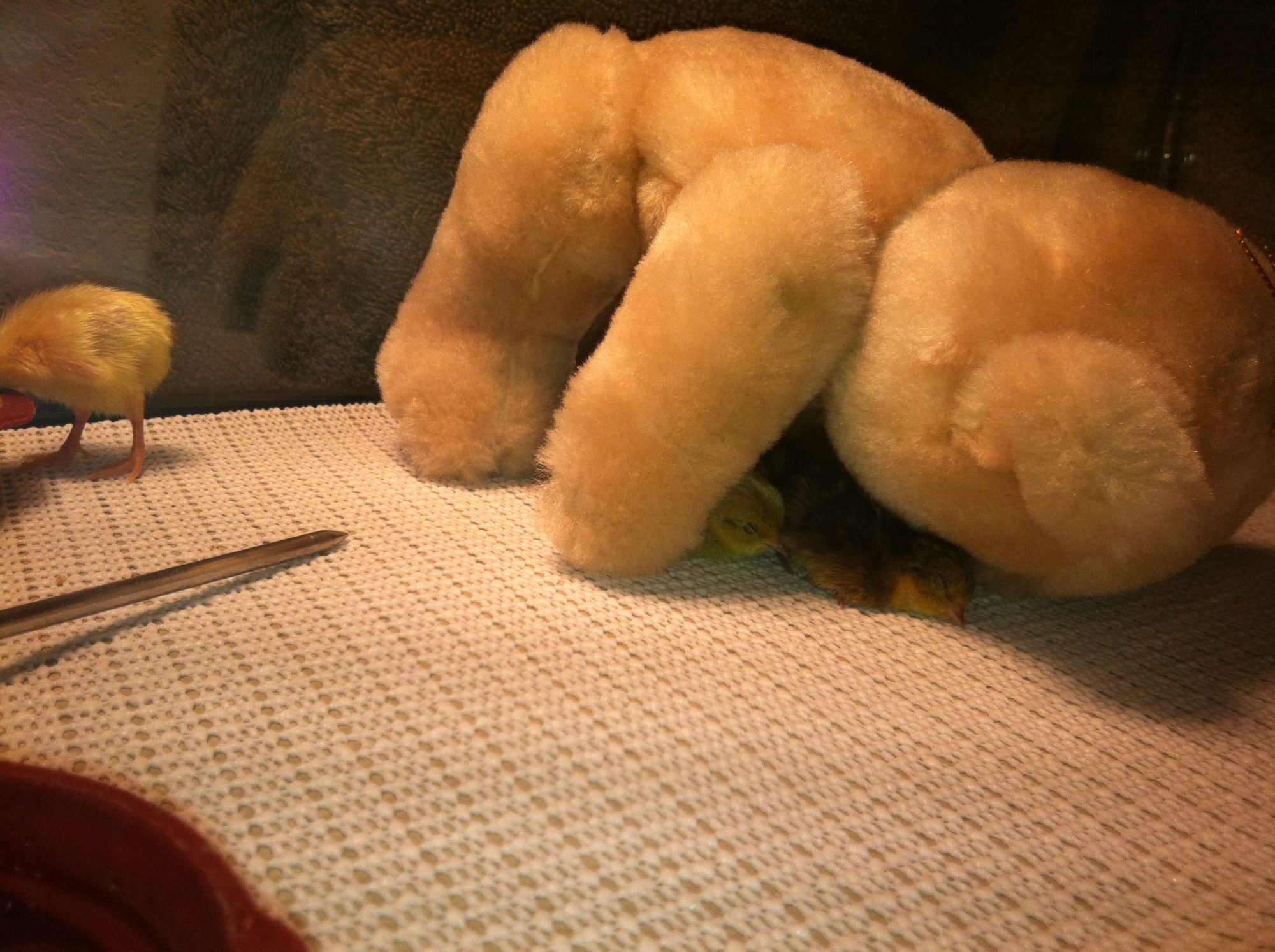 Awww... cute little babies! I put a stuffed animal in the brooder with my button quail and they all cuddled next to it like it was mama. I had a kind of stiff teady bear that I put in on all fours so they could get under it. It was super cute.
